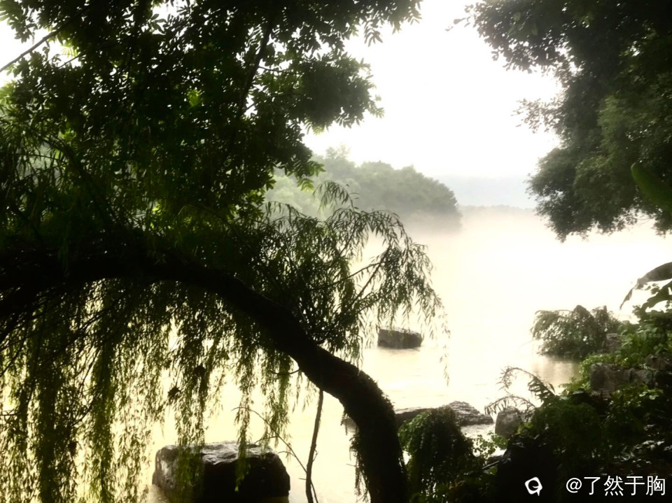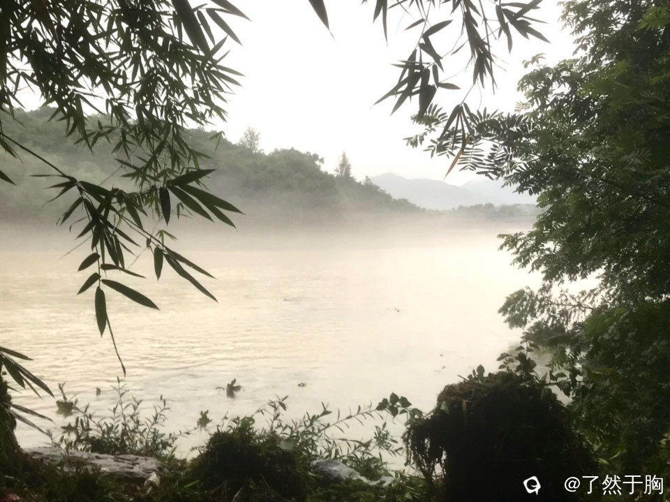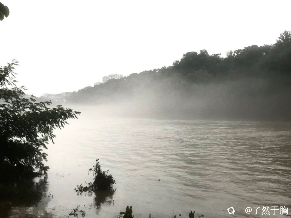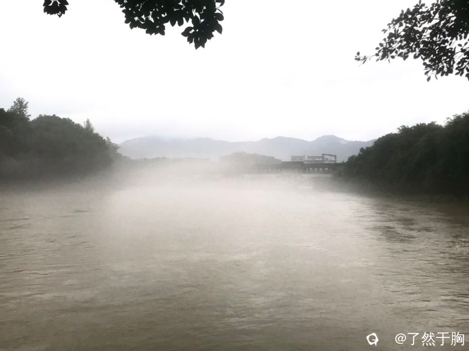 今天雨小了,江水退了,但下午雨又下起来了,江上又起平流雾,形成了一幅幅梦幻迷离的美景。