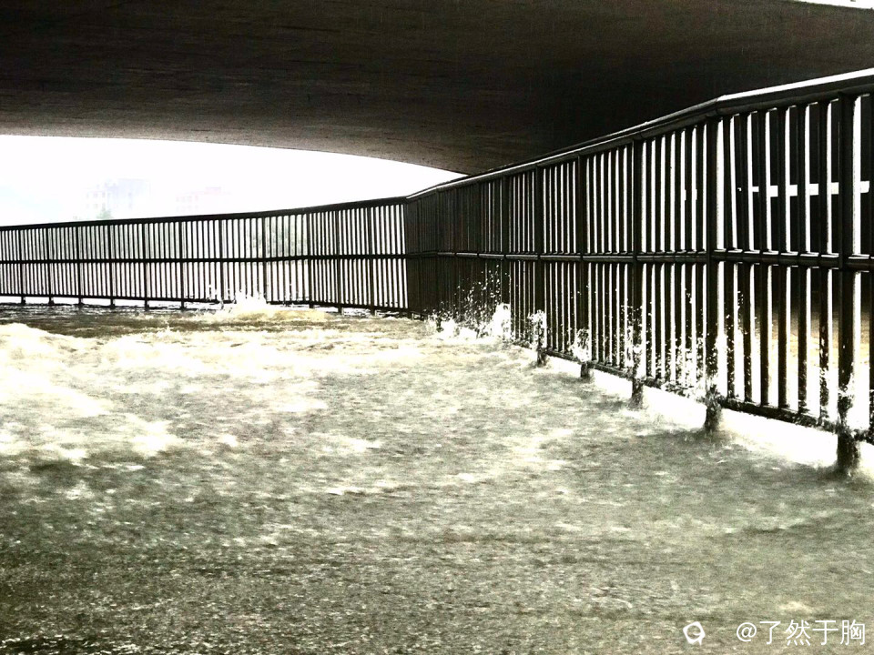 至下午五时许,江水猛涨近两米,几乎将江畔步道一米多高的栏杆淹没了