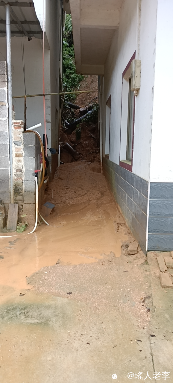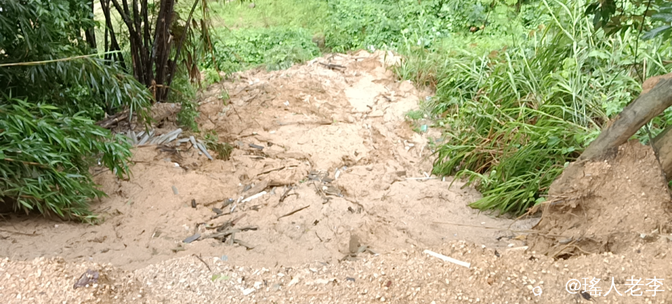 时至今日,恭城域内的大雨依然在下,兰洞瑶山内的公路面,随处都是因雨滑坡下的黄泥和石头,黄泥浆水漫流房前路面,灾情甚是严重。