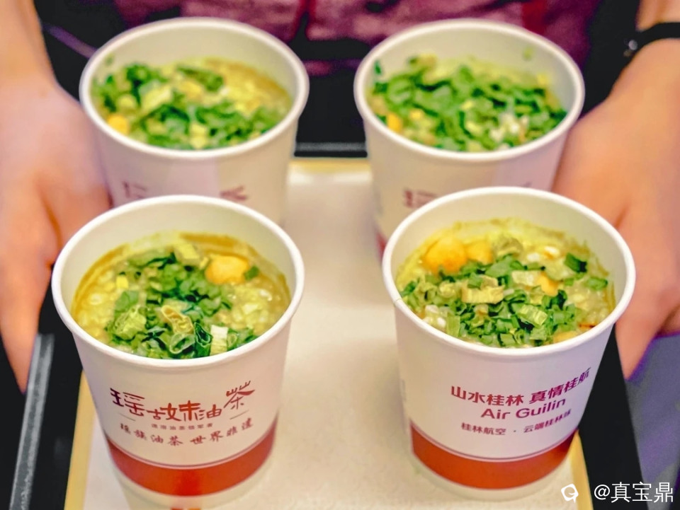 此刻,乘务员呈上的是云端桂林味系列——恭城油茶。这一碗浓醇的茶汤,宛如一幅流动的画卷,承载着千年的文化与风情。