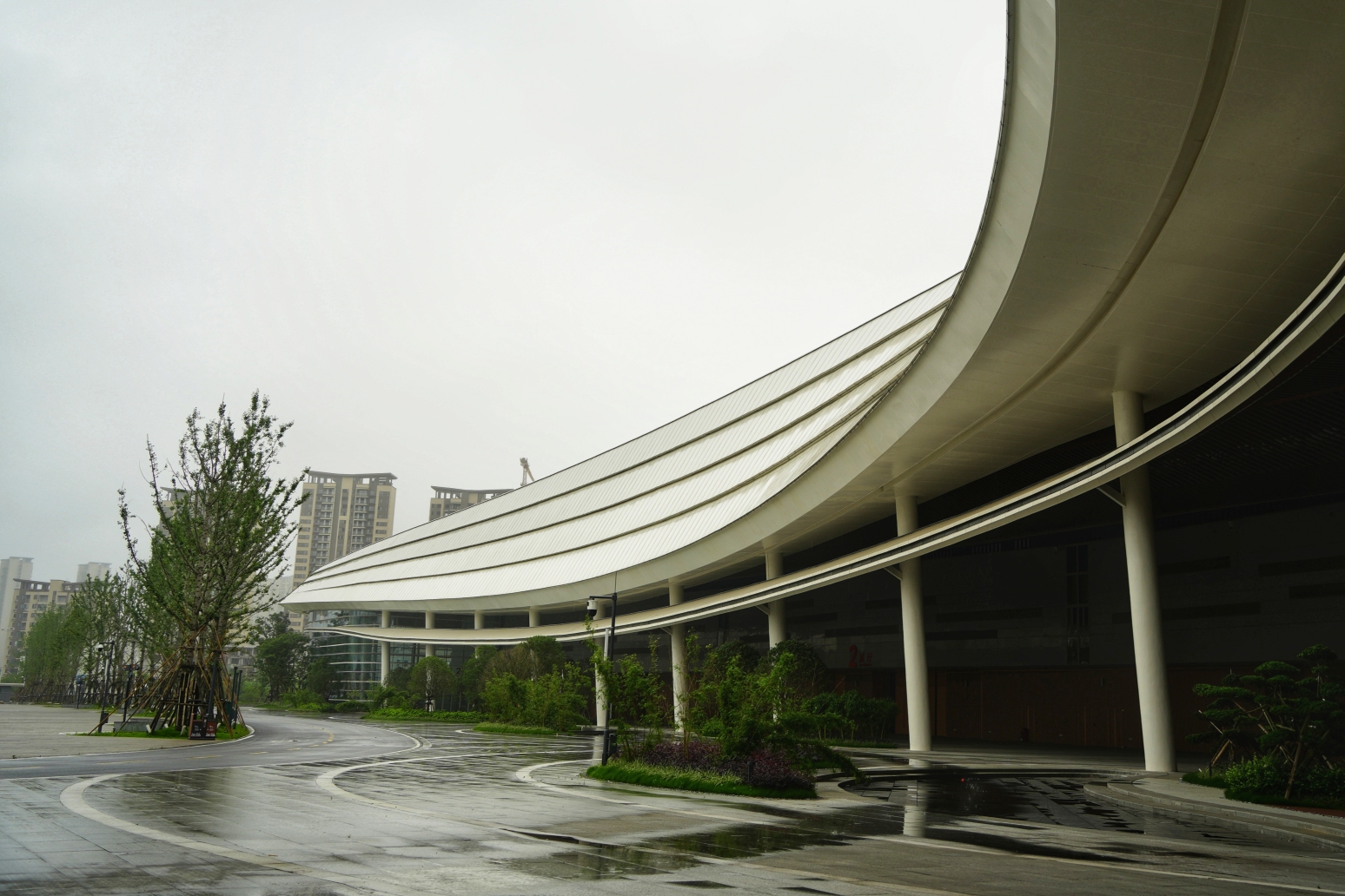 国际会展中心这条优美流动的长弧曲线,犹如龙脊梯田,层层叠叠,优雅灵动,线条突然向上翻卷,来去无踪,给人带来前所未有的视觉冲击力。让人忘记了它是座雄伟而坚固的现代水泥建筑。