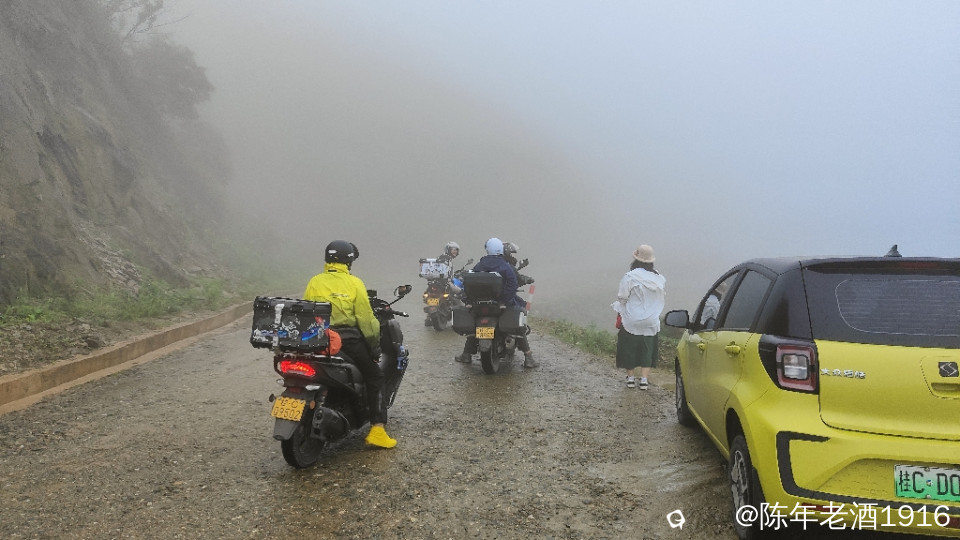 到达资源境内没有下雨,继续按导航向白马山一带行驶时,沿途群山都是拦腰雾,仙气飘飘。但由于心之所向,也顾不上停下步伐来记录这沿途的美景,心中期盼更美的景就在前方。可天有不测风云,沿着蜿蜒曲折的山路继续向上前行,越接近目的地,水雾越来越重,能见度越来越低,路的两侧白茫茫一片,什么都看不到,方向感完全缺失,漫山野花完全不知所踪,索性又打转退了回来雾小的地方,试着用无人机打探一下地形,可上空也是白茫茫的什么也看不到。此时,有商业团队中巴车开进去,偶尔也有私家车摩托车队陆续向里开进。