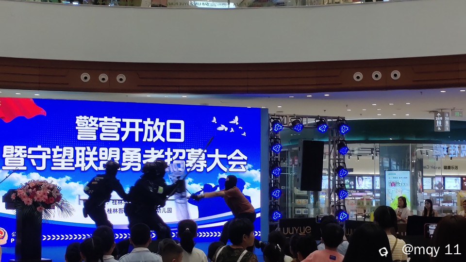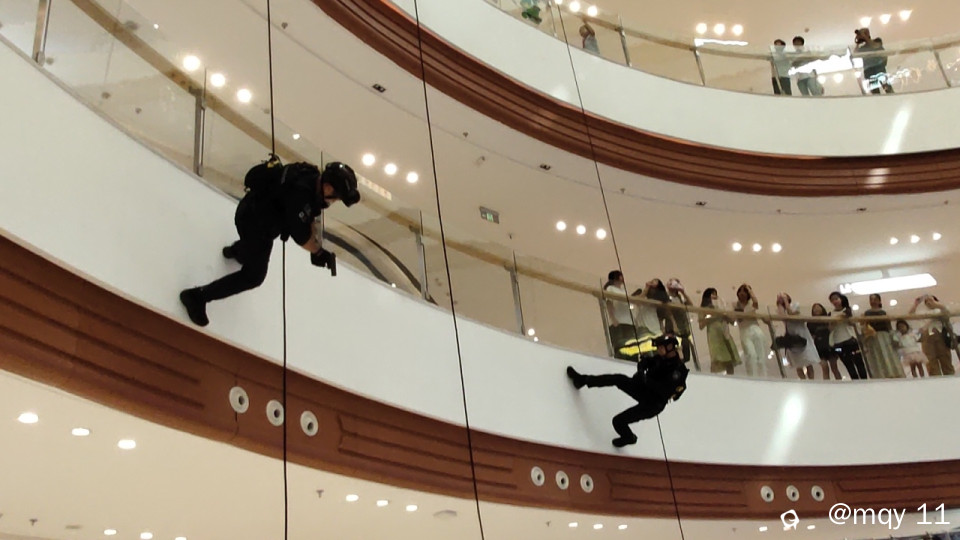 2024年7月的暑假,正式开始,位于桂林临桂某大型商场内,一群穿着神秘制服的黑衣人,出现在商场的栏杆之外,这是高空防恐演练。