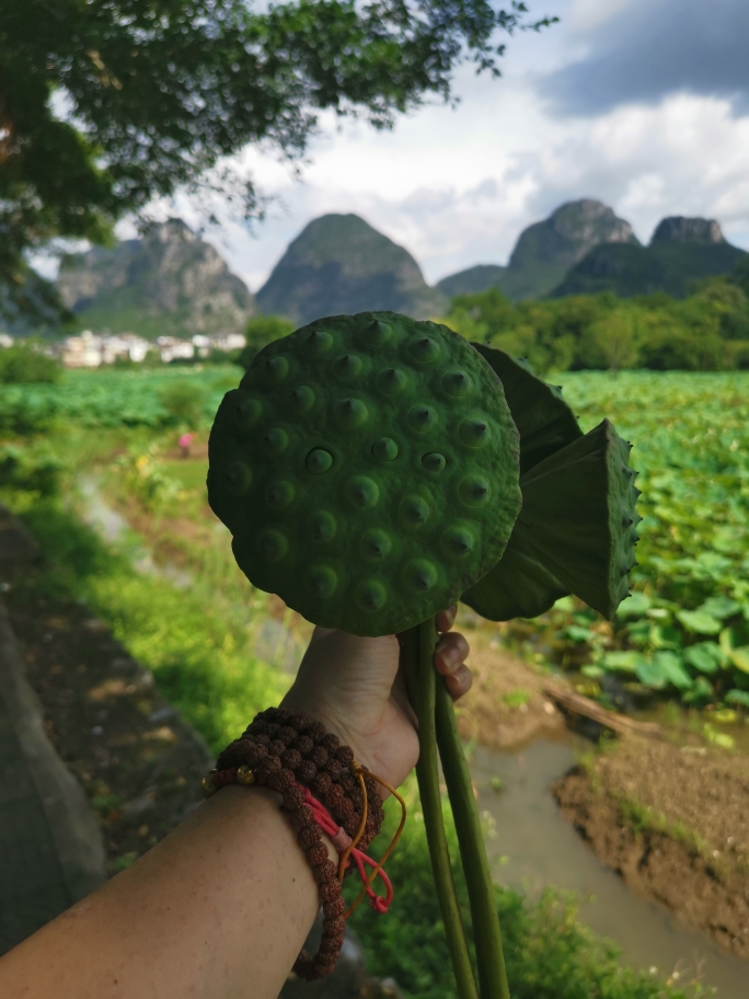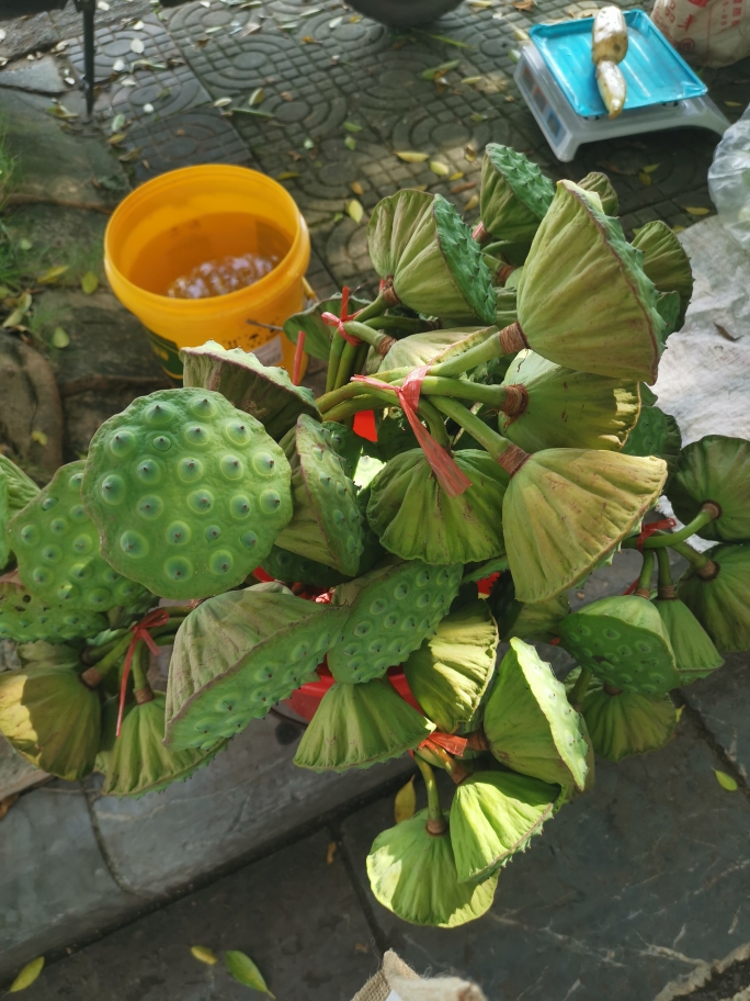 今天路过桂林塔附近,那里有一片荷花池,荷花渐渐没有了,只见一路的莲藕和莲蓬,于是下车买了点莲藕和莲蓬。