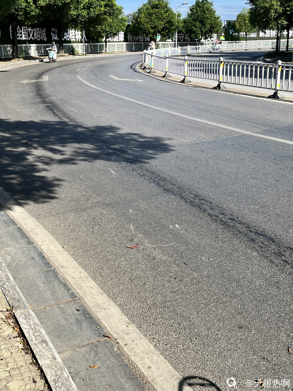 今天上午有个小姐姐在这个位置就翻车摔倒了。这个大转弯路上有一长串的汽油,骑车经过的时候就打滑翻车了,大家路过一定要避开这个汽油!