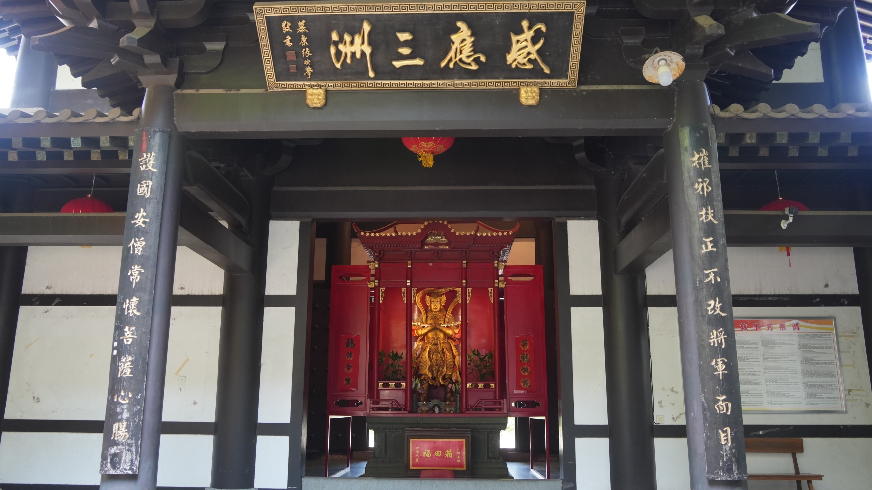 弥勒背后是个大佛龛,龛中站着一位手执金刚杵的韦驮将军像。