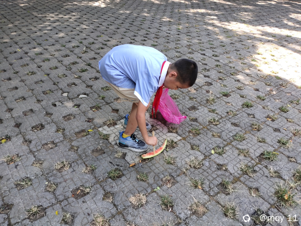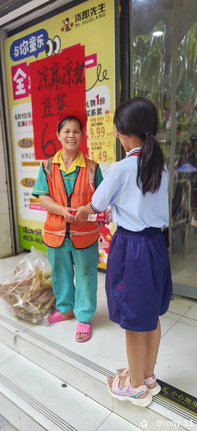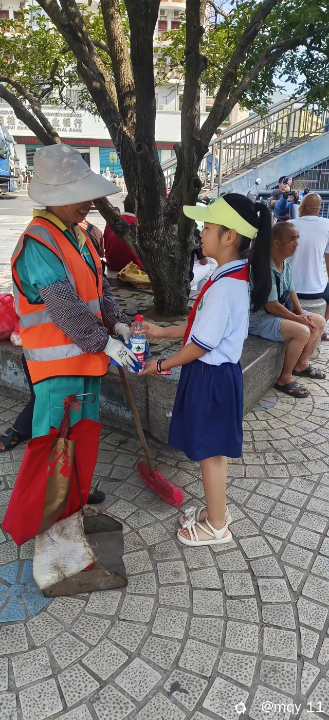 而在桂林临桂金山广场,却有一群“小把爷”,他们不是在家吹空调,他们是走在路上,给正在一线辛苦忙碌的环卫工人们,送去自己的一点爱心,把爷们利用自己的零花钱,买来了西瓜及清凉饮料,亲手送到酷暑天气,正在忙碌的环卫工人手中,让环卫工人能吃上一口甜甜的西瓜,能上一瓶水,感受到清凉。