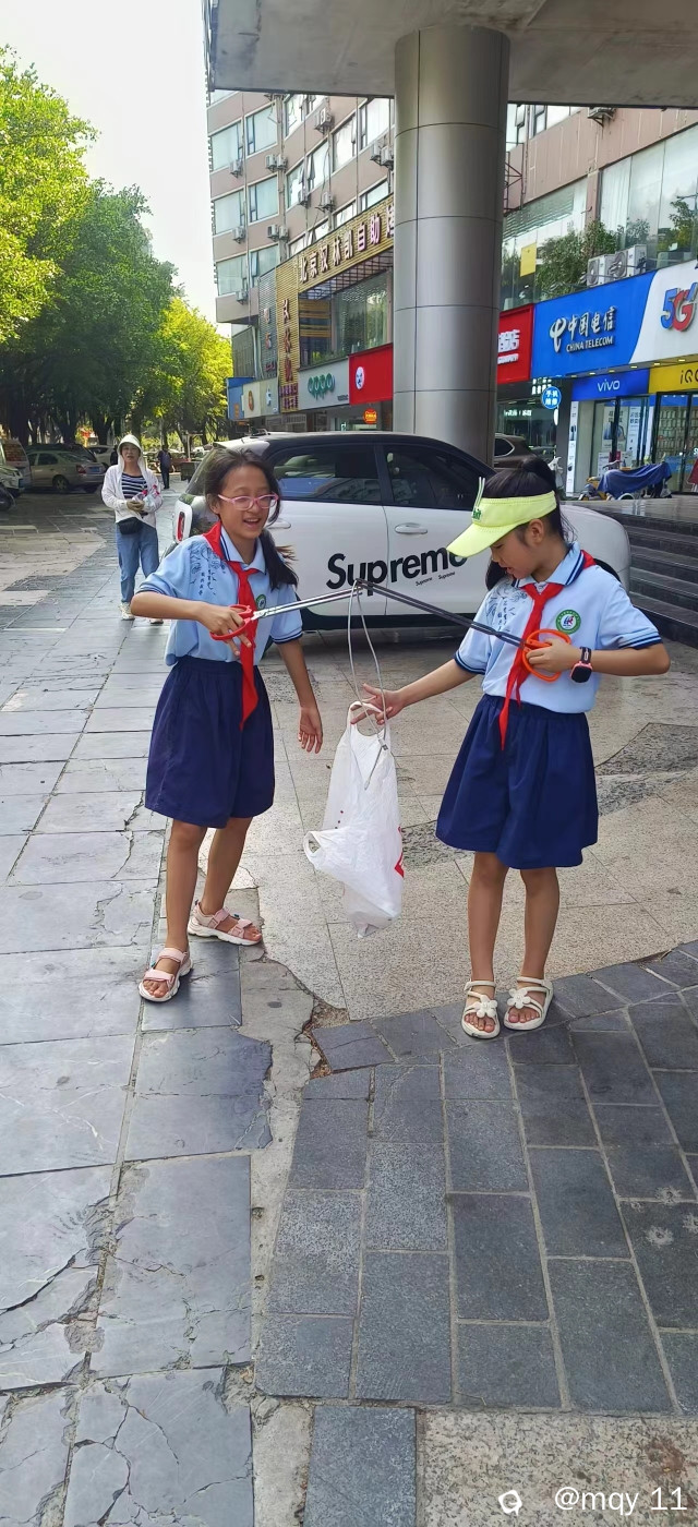 有的在清扫落叶,有的在捡拾丢弃的垃圾,有的在派发着防骗,防毒,防溺水等安全教育宣传单。
