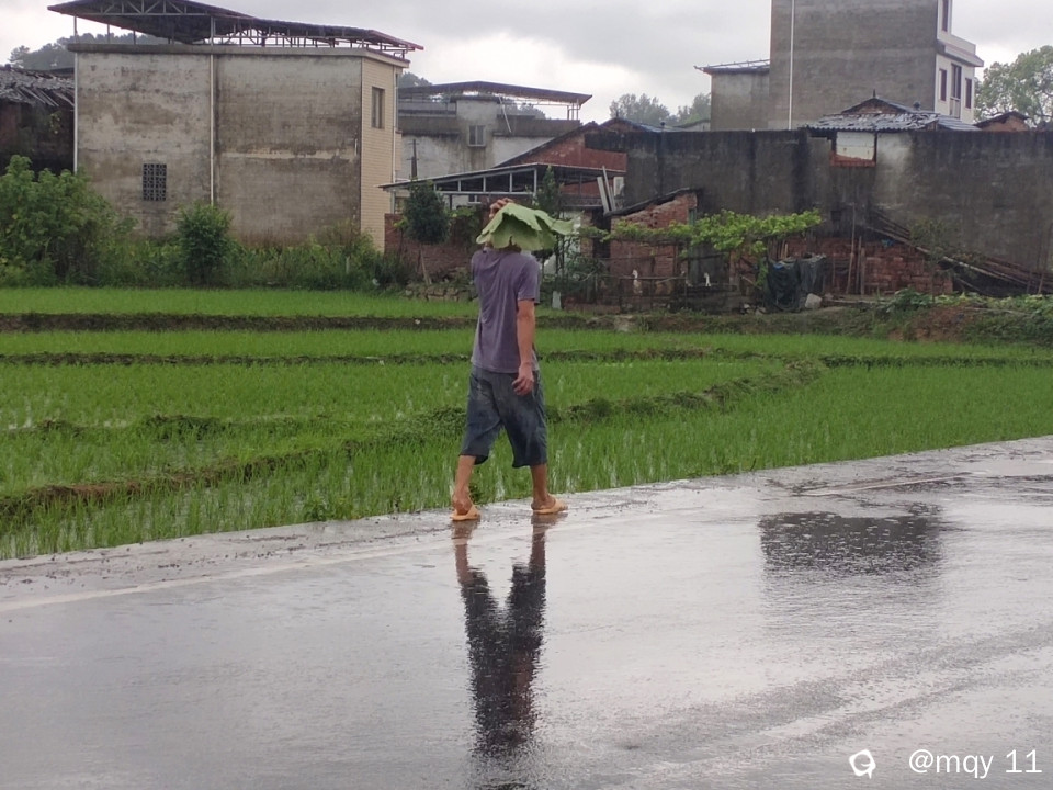 看着眼前的大哥,下着雨,还高兴得乐呵呵,带起了一顶“荷叶帽”,再看他的衣服,都已经湿透,到底是汗水还是雨水淋湿,从大哥的表情看,已经不重要了,因为它有一顶“荷叶帽”,它可以遮风挡雨。