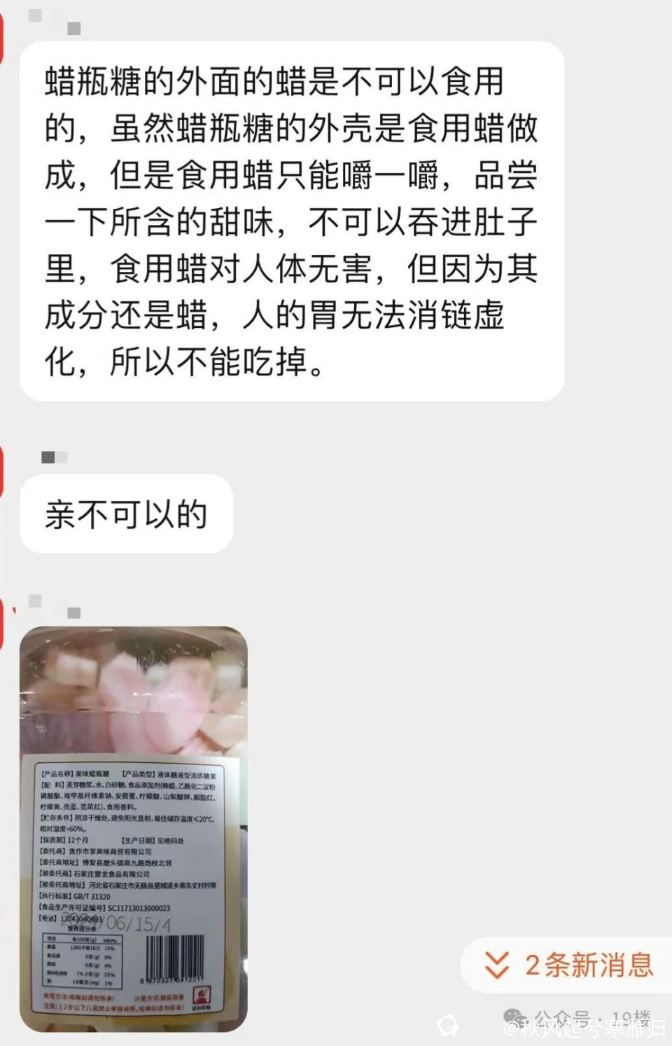 随机点开一家10万+人付款的商品页面,志玲通过消费者的身份与店铺客服人员聊天得知,蜡瓶糖的外面的蜡是不可以食用的,“虽然蜡瓶糖的外壳是食用蜡做成,但是食用蜡只能嚼一嚼,品尝一下所含的甜味,不可以吞进肚子里,食用蜡对人体无害,但因为其成分还是蜡,人的胃无法消化,所以不能吃掉。”