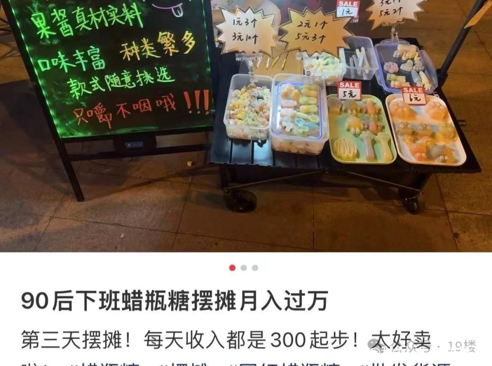 随着蜡瓶糖的爆火,社交平台上不少网友看中了其中的商机,纷纷开始线下销售。在众多蜡瓶糖摆摊的分享内容中,有网友更是发文表示“下班蜡瓶糖摆摊每天收入300起步,月入过万!”