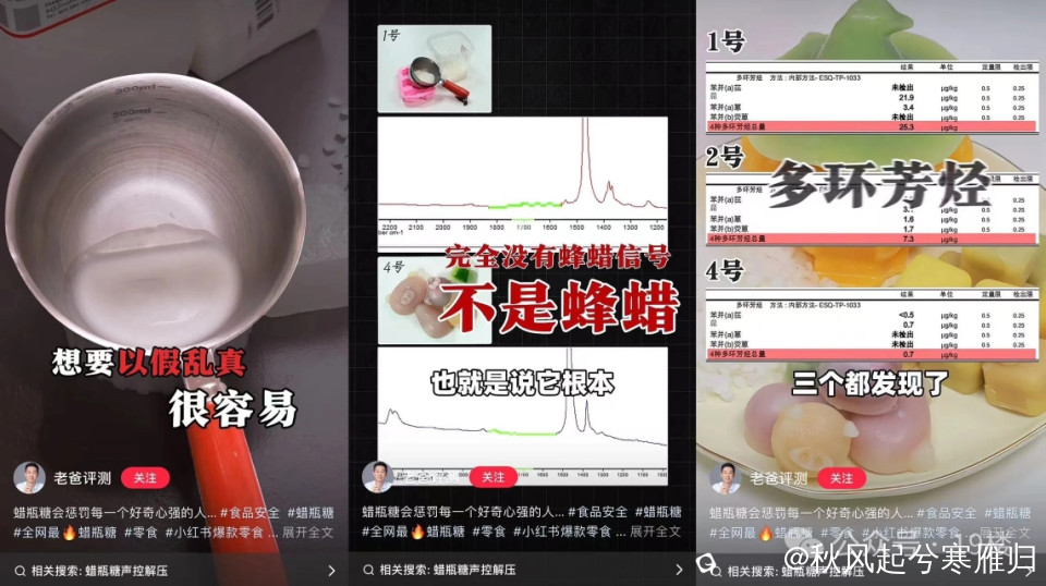 实际上,关于蜡瓶糖的相关讨论话题热度一直居高不下。志玲发现,在短视频平台上,博主老爸评测在视频中提及,工业石蜡与高纯度的蜂蜡放在一起甚至混合,肉眼根本看不出区别,“想要以假乱真,很容易!”