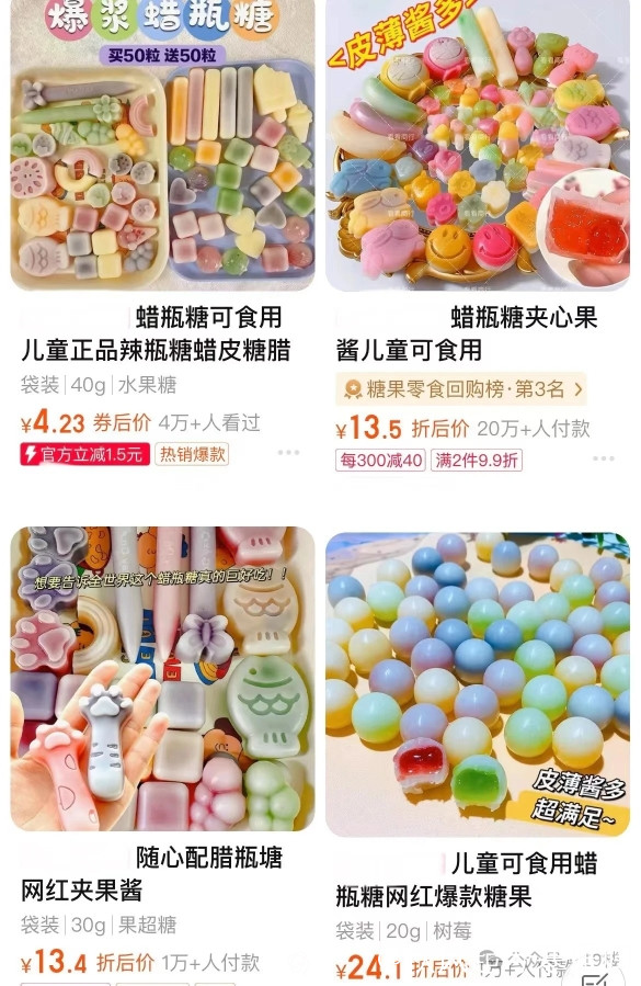 在某电商平台,可搜索到众多相关商品。滑动页面上的“可食用蜡瓶糖”、“网红零食蜡瓶糖”等产品介绍和食物造型令人眼花缭乱,价格从2元到50元不等,其中有商家页面显示20万+人付款。