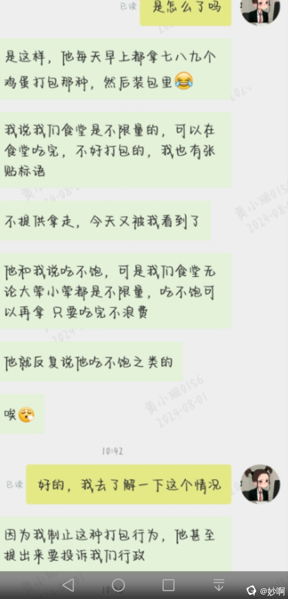 所谓鸡蛋事件,就是他总觉得自己要多吃蛋白质,出个差都要带上豆浆机,早晚在宿舍打豆浆喝,这还不够。公司食堂早上都有鸡蛋的,他早上吃4个鸡蛋都不是问题,关键是人家规定不给打包带出去的,他偏偏不信邪,每次盘子上都拿7~8~9个鸡蛋,实际上拿10个,早上吃4个,中午和晚上都要吃。鸡蛋堆成山,过于显眼,食堂阿姨和行政说了之后,他成了重点监测对象,果不其然某天早上,他继续拿鸡蛋,被行政人员逮住说不能带出去,他和人家理论说吃不饱,还数说对方管理食堂的伙食太差,要去投诉食堂。行政的直接问他是哪个部门的,领导谁。没想到他这个憨憨竟把我个卖了。真是丢不起个人啊。