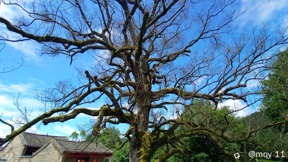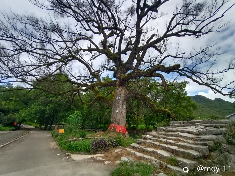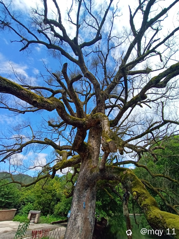 因为古树的巨大,彷若参天,粗壮的树干,围着祈福的红绸,大树的树枝,也是非常的粗大,同时带着苔藓,虽然近看,古树没有什么树叶,可是站在桥上近观,也被它的巍峨而震撼,被它的盘枝发达而树不清。