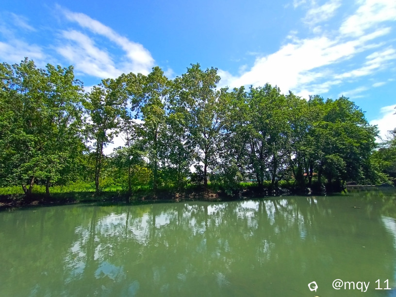 蓝天白云,两岸整齐排列的绿树,随着丰富的水源滋润,两岸绿树成荫,把原本宽阔的河面,遮挡成绿荫水道,可惜,此时没有船,不然将会有一种江南水乡,倩怡游情之梦的感觉。