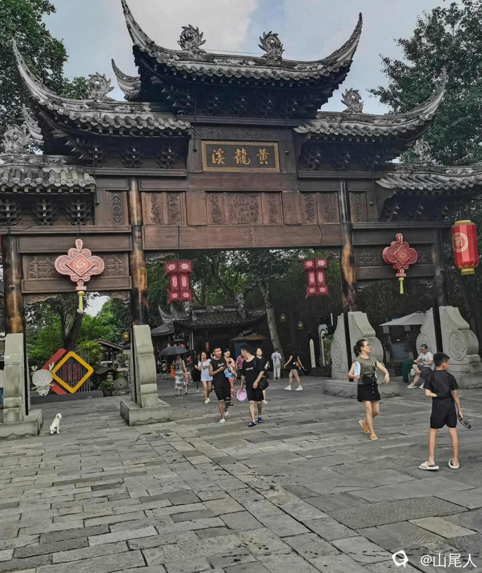 黄龙落座高台,龙尾喷水成清溪,蜿蜒数里。两侧街道,依溪傍水,店铺林立。溪中游客消夏戏水,两岸商铺游人如织,形成以川西民居建筑风格为主,独具特色的戏水文化美食一条街。每到夏日,游客蜂拥而至,两岸游人如织,戏水消夏,观览古镇,品尝美食,成为黄龙溪独有的消夏旅游奇观。黄龙溪古镇于2018年5月1日,曾创下单日接待游客9.2万人次的纪录。