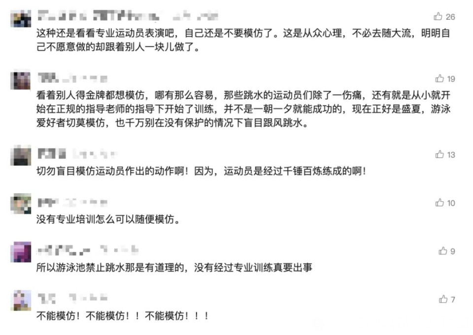 据专家科普,高台跳水的危险是多种多样的,首先高度下坠导致的加速度会让人体承受巨大的冲击力。而且跳水动作也有不少难度,如果跳水时没有保持正确的姿势,或者在入水时没有恰当地调整角度,都可能导致骨折或其他伤害。