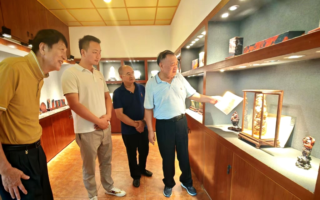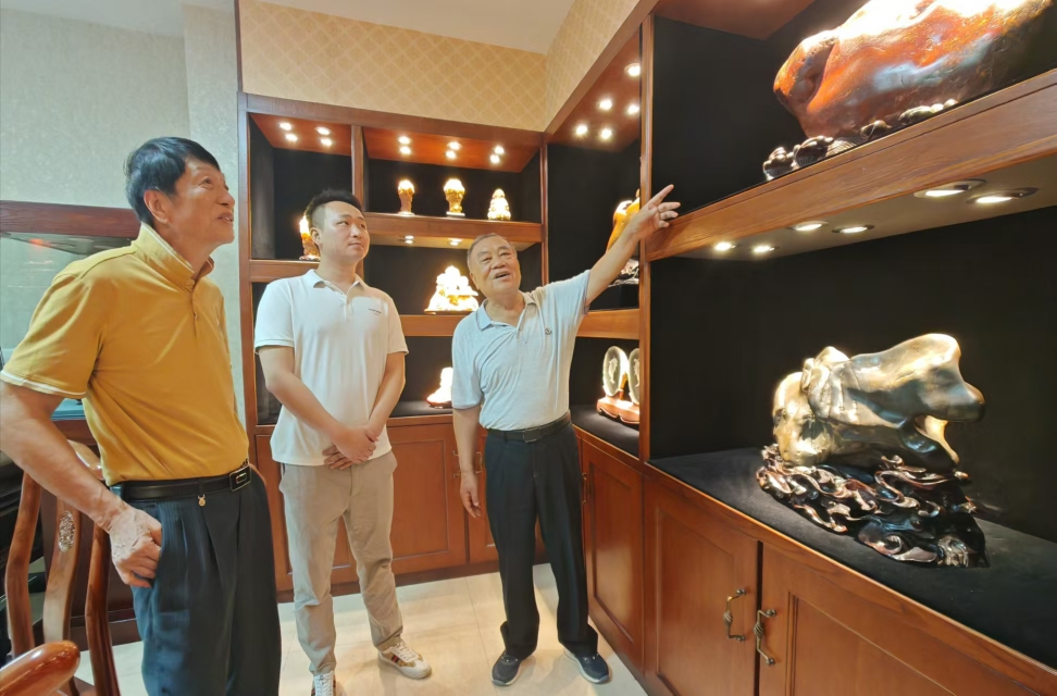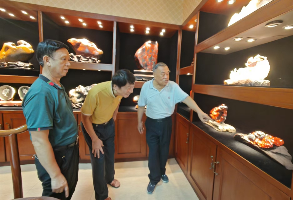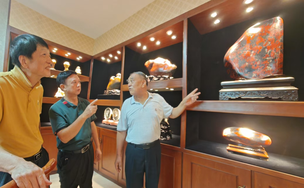 今天上午,我与桂林中艺五彩碑林馆长陈沛彬先生、陆总一行四人,到原桂林地委书记、桂林鸡血玉创始人,己91高龄的唐正安老先生“观石堂”艺术馆、“桂林红碧源”鸡血玉艺术馆参观考察。今年龙年春节大年三十,中央电视台第4套节目《传奇中国节》用直播方式将桂林鸡血玉的龙头印章作为桂林龙胜特优产品摆放在栏目内容来介绍。唐老先生精神闪烁,一直陪同我们参观鸡血玉藏馆参观并作详细的介绍与讲解。桂林鸡血玉的精彩已多次介绍和讲解,请大家观玉讲故事。人生相识容易,相知不难,那些看尽你的缺点,知道你的毛病,却依然真心记住你的好,能理解与包容,不用天天见面,却永远是你最想念的那个人。随着时间的推移,年龄的增长,慢慢的就会领悟到时光的精彩,朋友贵在风雨同行。生活,是一场既定又不断变幻的旅程,像一阵风,将你吹得东倒西歪,它又像一朵云,轻盈地漂浮在你的眼前。不管是风还是云,都是生活的一部分,都值得我们去体验和感悟,人生才有彩虹 ,才有滋味。故事是由精彩内涵决定的人的爱好可以增添生活的许多情趣,在桂林这片美丽的土地上寻觅灵感,真是让人沉醉其中无法自拔啊!唐老先生尽管年迈,但依然对桂林鸡血玉的开拓与忠爱有加,充满热情与爱恋,他的精神让我对生活充满信心和希望!老先生的活力令人敬佩,年龄不是阻碍他探索世界的理由!而是充满对生活的一种情怀与情趣。