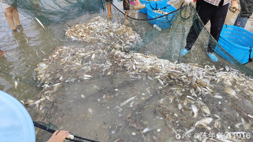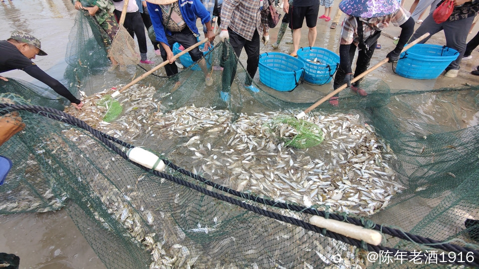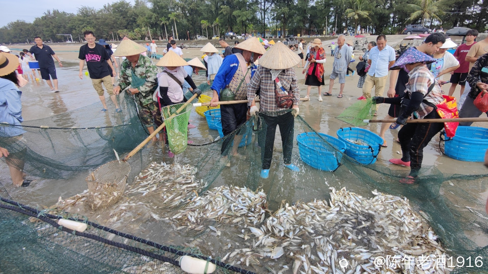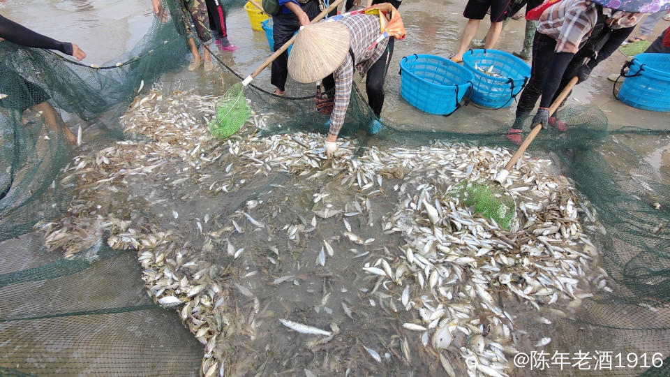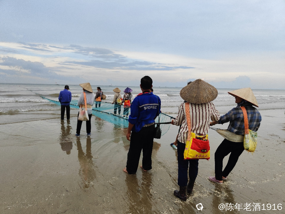 起先是由渔民用船将网下到稍远处的海里,之后两头由10多个渔民用麻绳慢慢将网往岸边拉回,看着好休闲,有的一边同时在吃早餐、有的一边在抽烟、有的一边在刷手机,给人的感觉就是漫不经心的样子,整个过程足足花了两个多小时。从渔获来看,似乎并不理想,基本都是些小鱼小虾,大根也就200斤差不多。但对于第一次见海里拉大网的我来讲,已经是很不错了,毕竟这里是近海域。