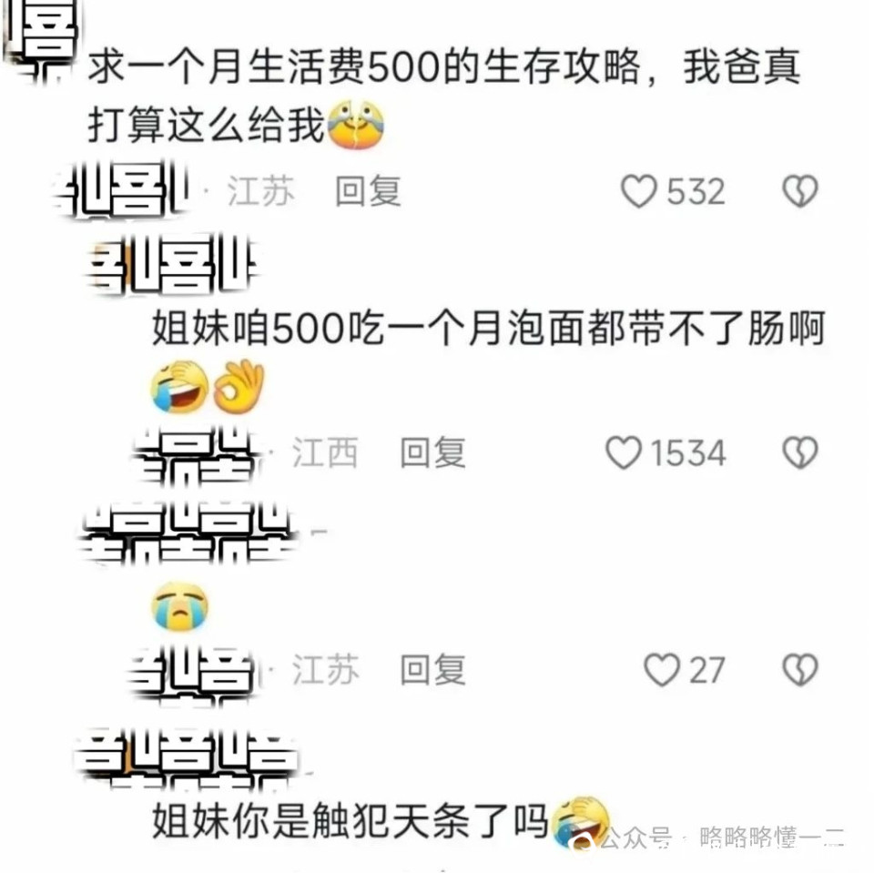 网友的评论更加扎心,一个月500块钱的生活费,吃泡面都带不了肠,真是出不了一点攻略,因为大家也没有这样的经历啊!