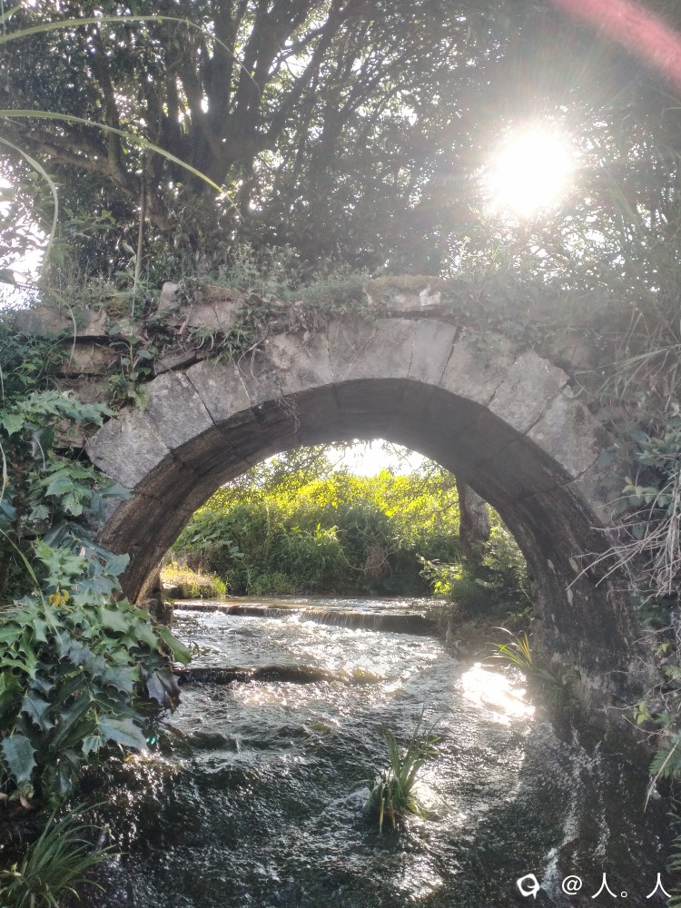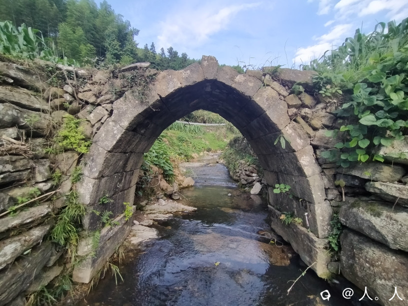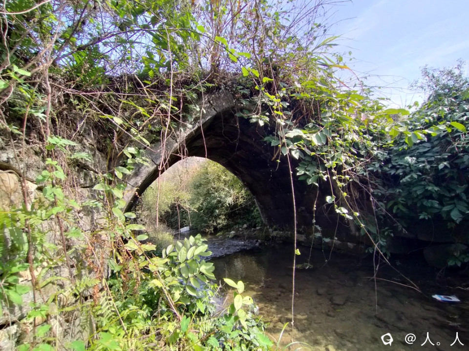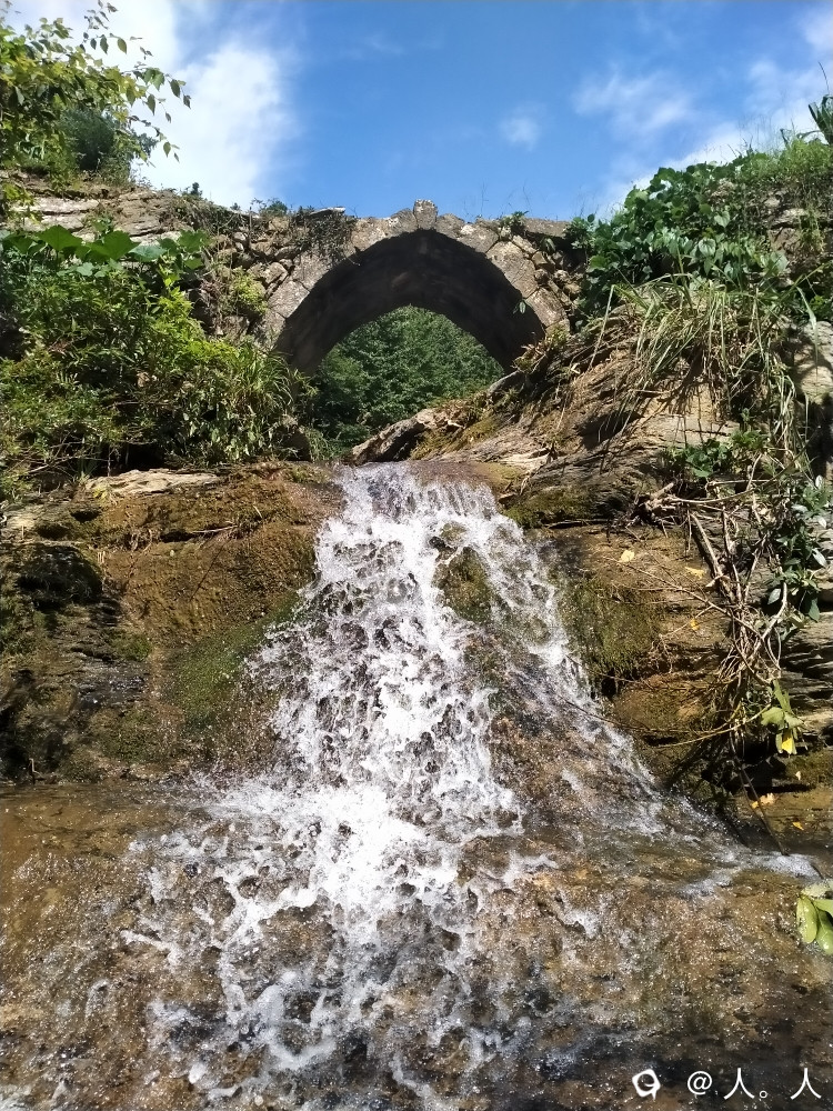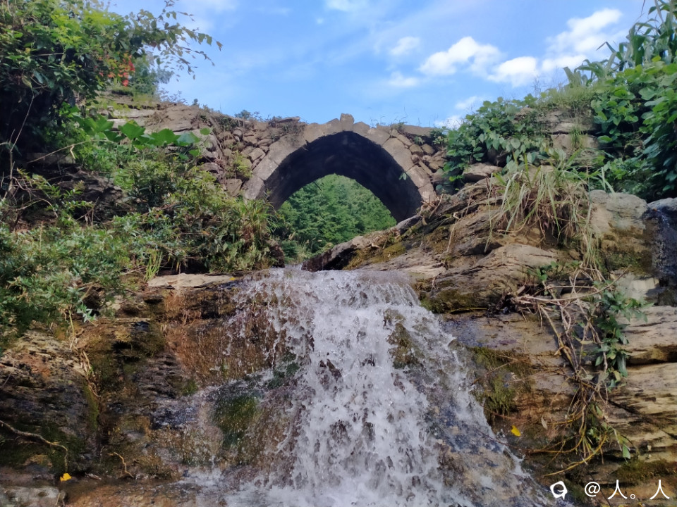 高尚富村到落家之间的这座远看略带三角形的石拱桥,有周围地貌以及小瀑布的加持,还有蓝天白云背景板,想不出名都难了。