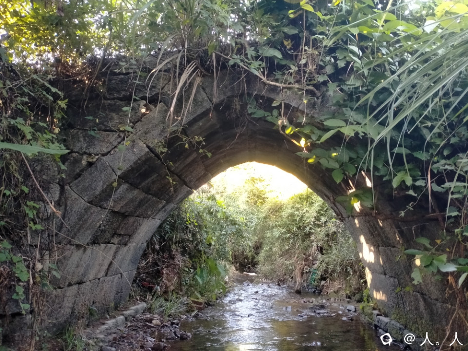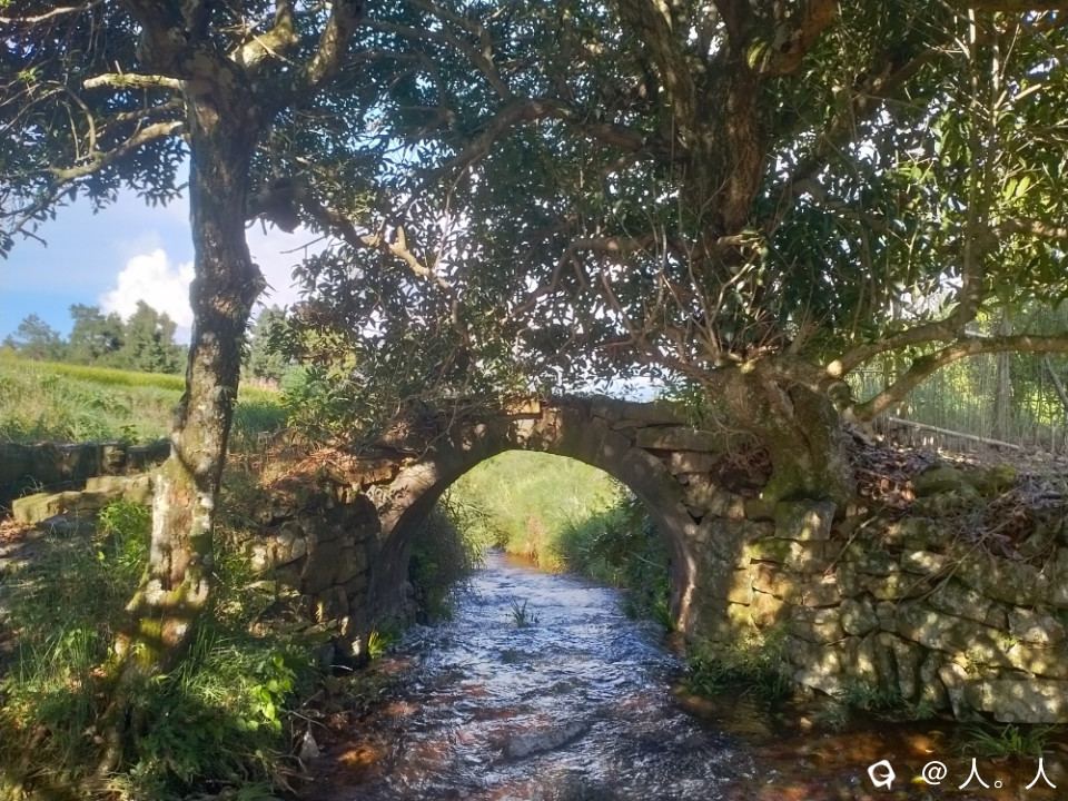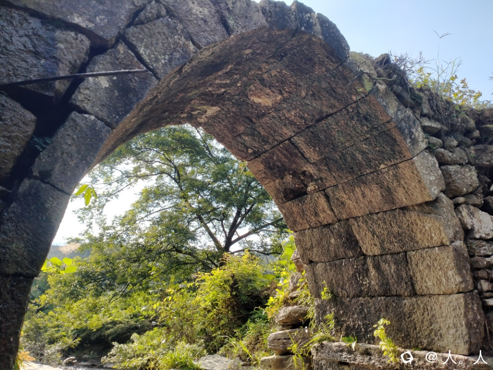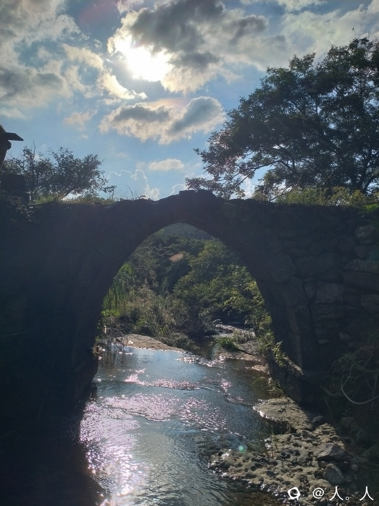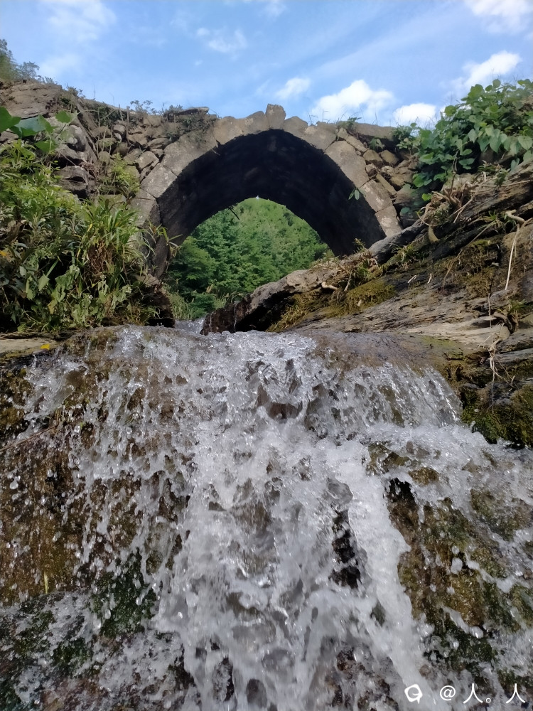 高尚富村到落家之间的这座远看略带三角形的石拱桥,有周围地貌以及小瀑布的加持,还有蓝天白云背景板,想不出名都难了。
