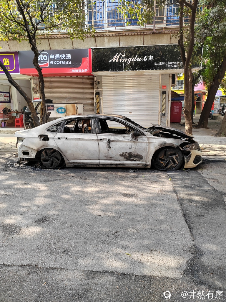 刚刚路过这里,发现这车燃烧成这样了。据路边社消息,是昨天晚上零晨3点钟发生的事,消防出动了,停在人行道上的一辆电单车挨得近,也被烧完还剩一个架子,所幸周边商铺和居民楼没受影响,走在旁边还有一股臭味。