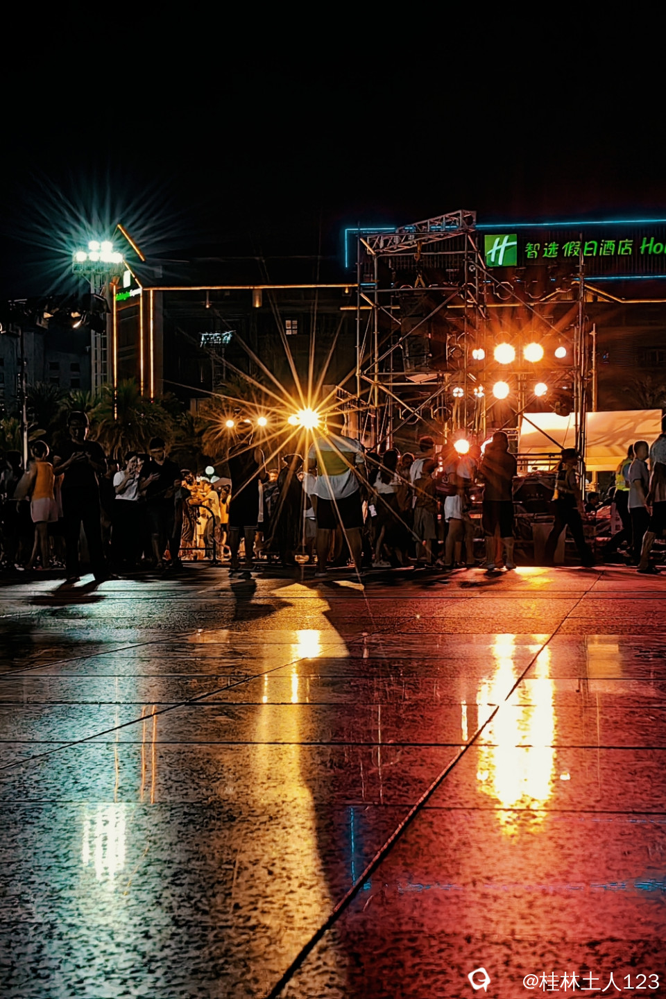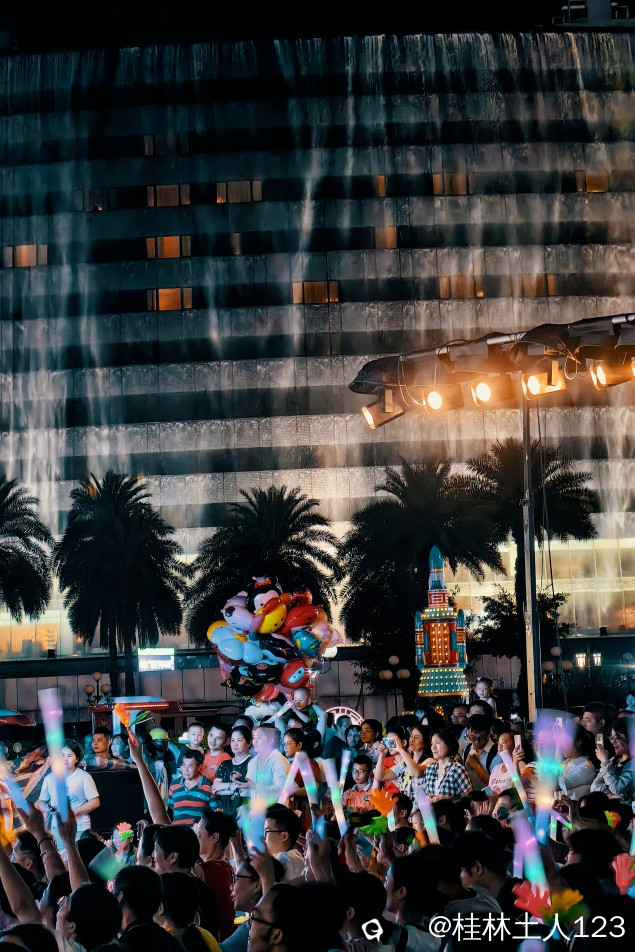 来桂林听免费的演唱会了,在桂林中心广场大瀑布中,免费听演唱会。唱响桂林,桂林歌圩第三场,今天桂林歌手唐磊带来了成名曲“丁香花”