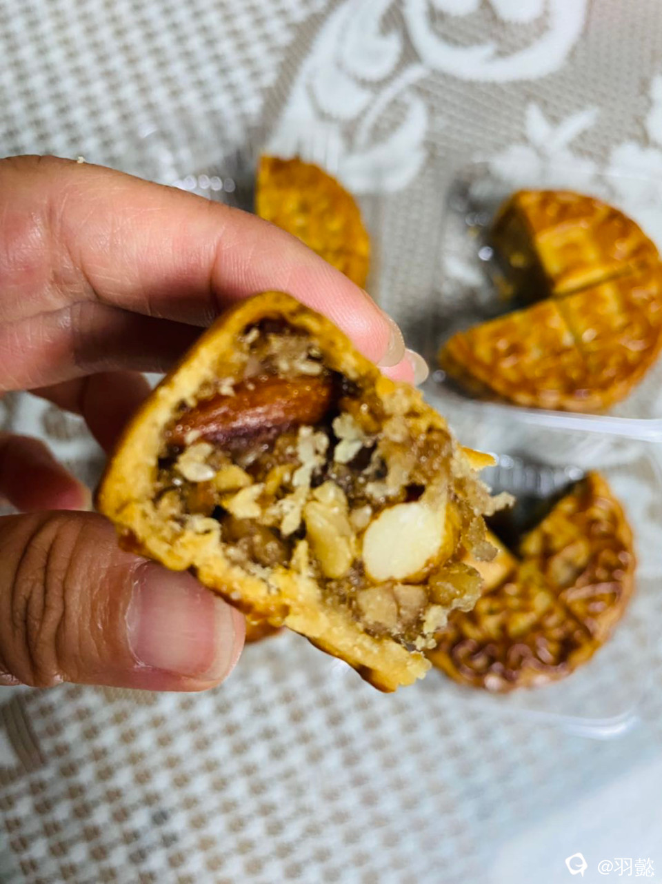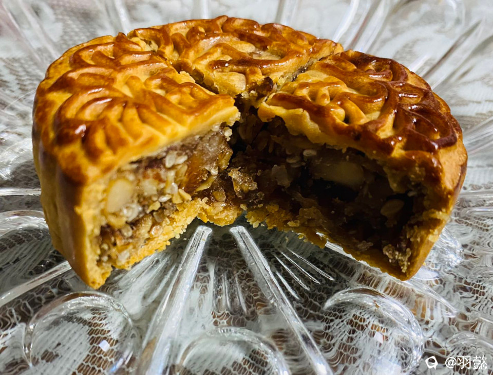 果真是用料十足!一刀切下去,满满的果仁,饼皮酥软,内馅果仁有嚼头,细细品尝,唇齿留香!