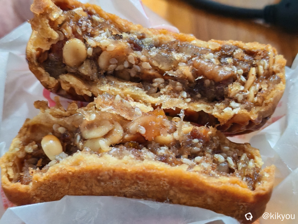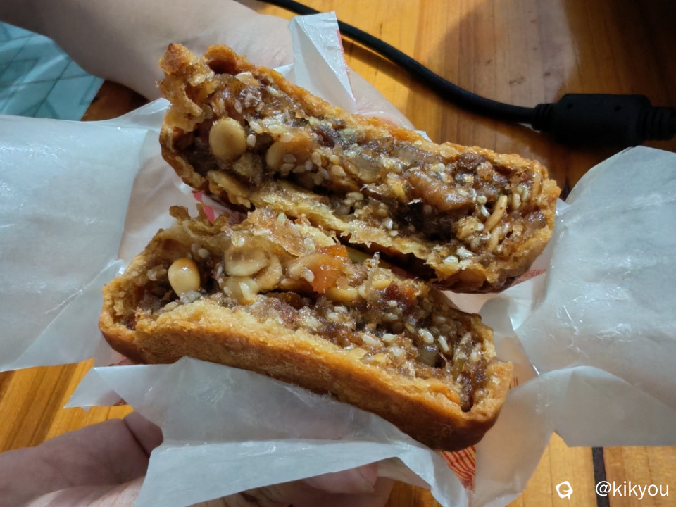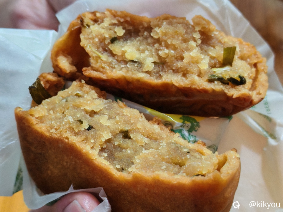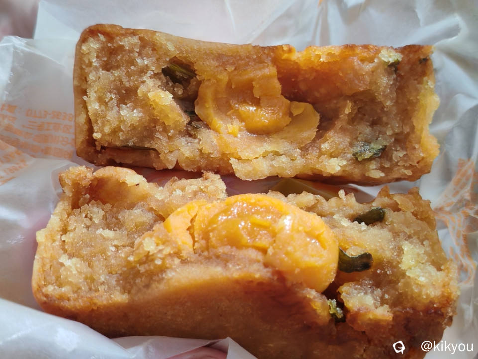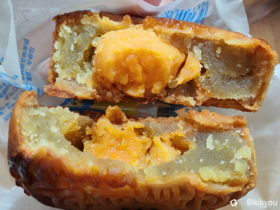 同样的葱香豆蓉馅,同样的油润又咸甜交织。不同的是里面嵌了一颗咸蛋黄,让整体风味更上一个层次。然后这个蛋黄是属于干干粉粉的那种,不是会流油的咸蛋黄。