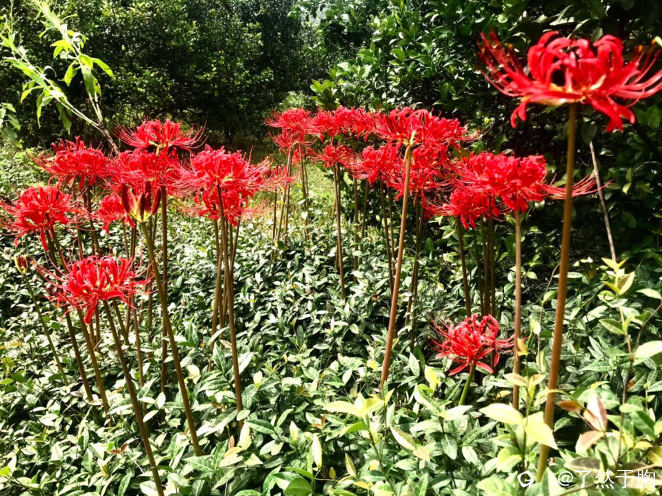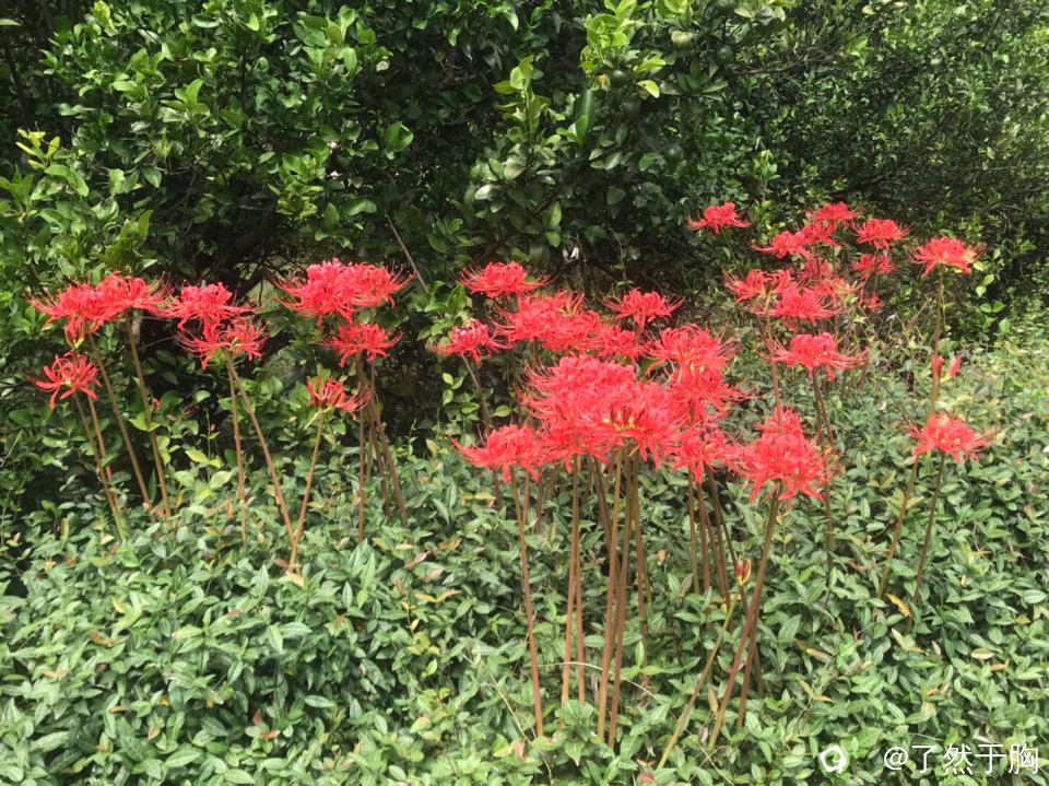临近新牛路村时,又是村级水泥路,岭上建有工厂,田间沟旁长有大片彼岸花,红艳艳的,煞是好看。