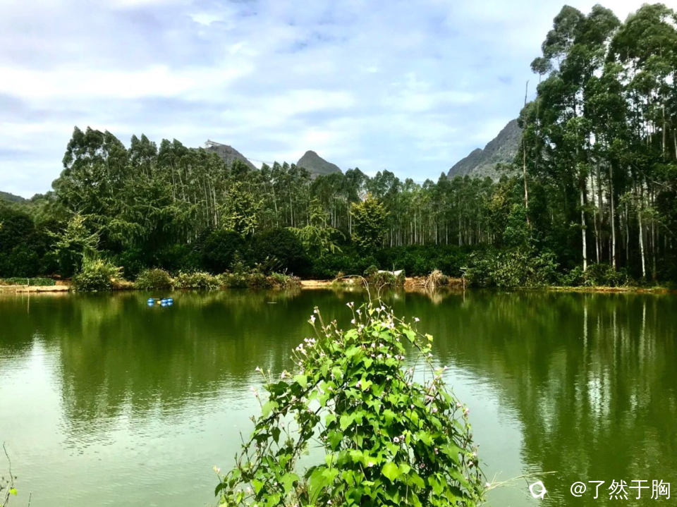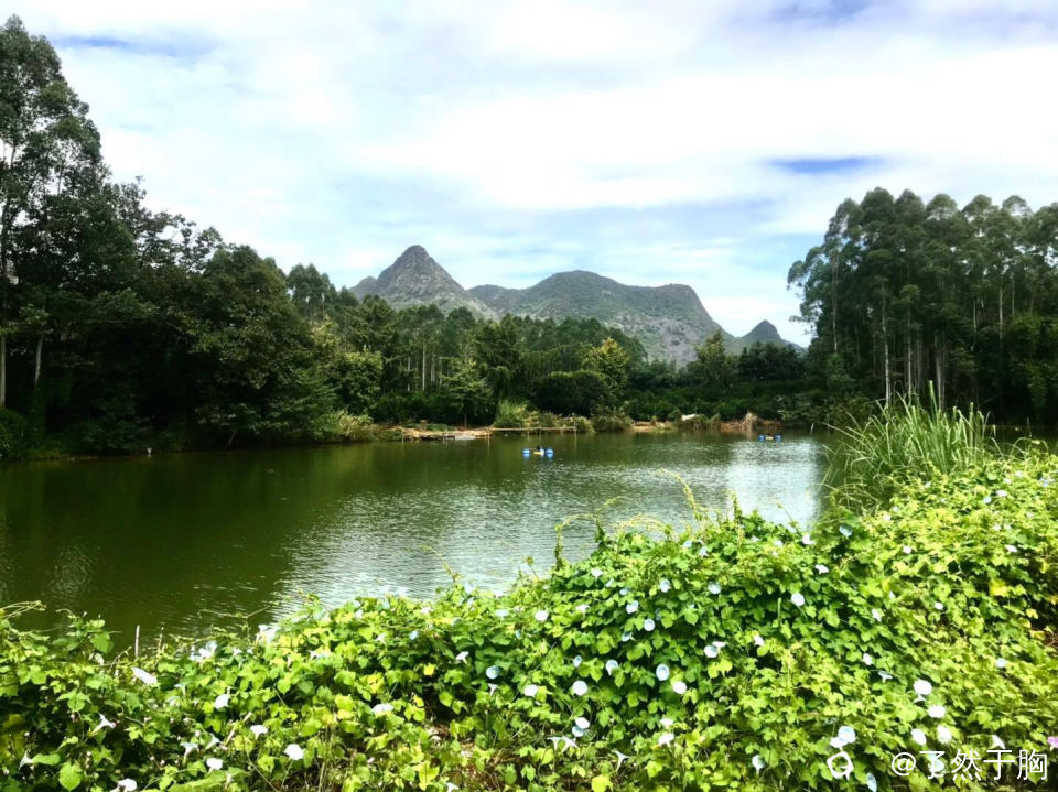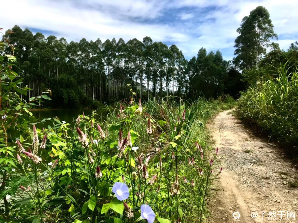 穿过新月塘村后,走的是山岭间机耕道,路边渔塘波光潋影,各种野花到处是,如诗如画。