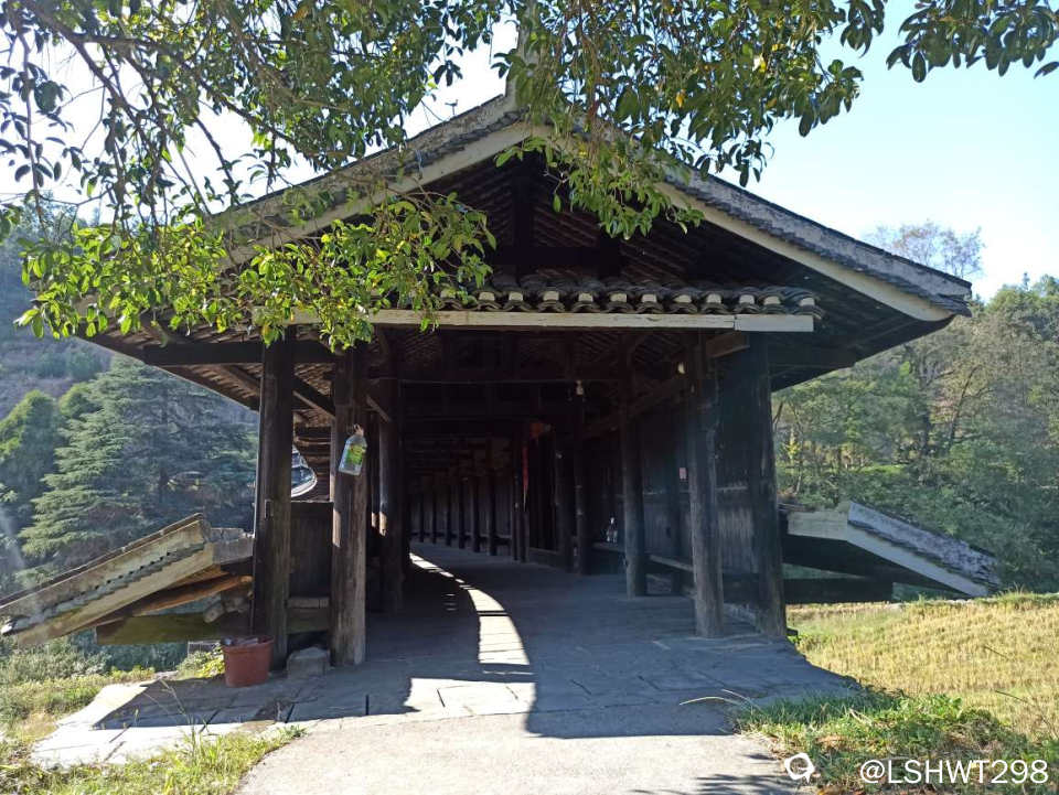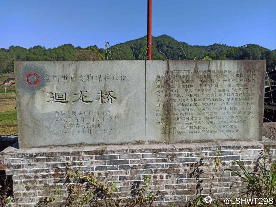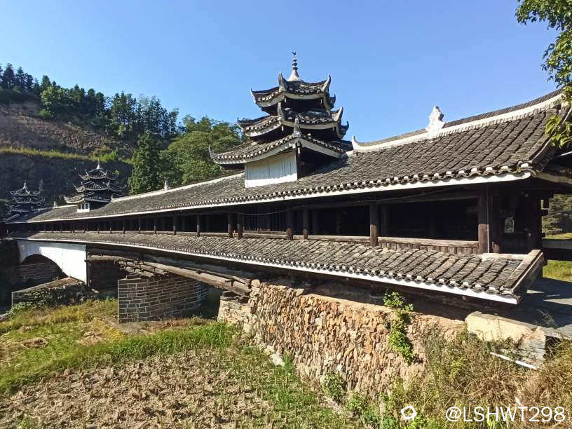 从坪坦到横岭,必经通道县目前最长、气势最强的一座风雨桥一一迴龙风雨桥(字略,下图有简介),必须是国保级。。。曾有报道,韩国按比例抄袭建了座在本国,有待论证。。。一路看过来的风雨桥,架在河床上的为何要用木板封闭并涂白漆,难道是为防腐而设,期待坛内大神解答,感谢!。。。