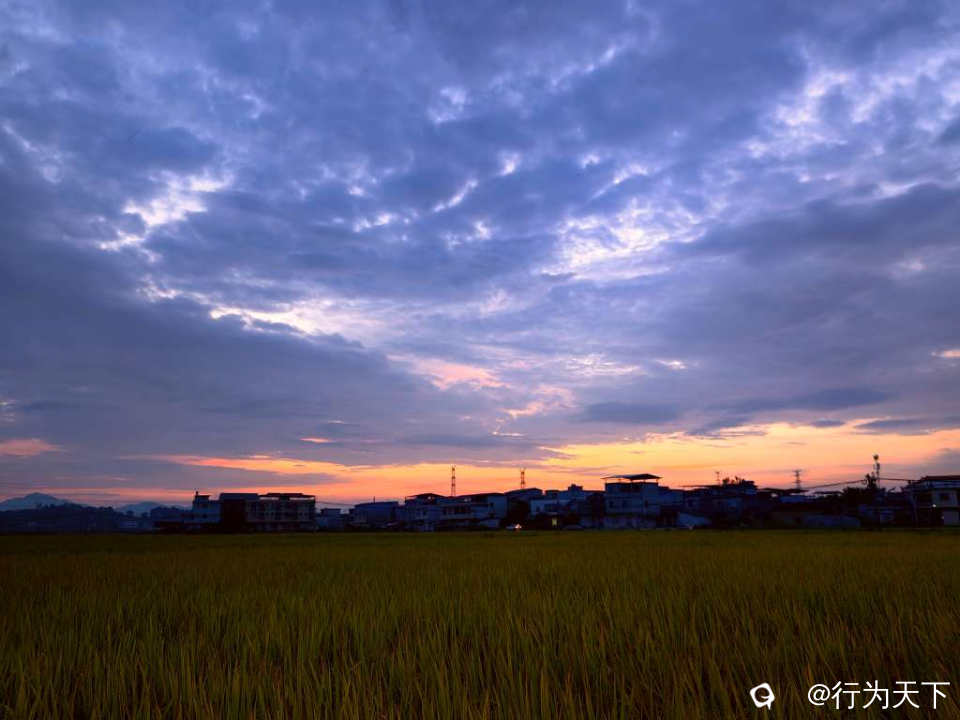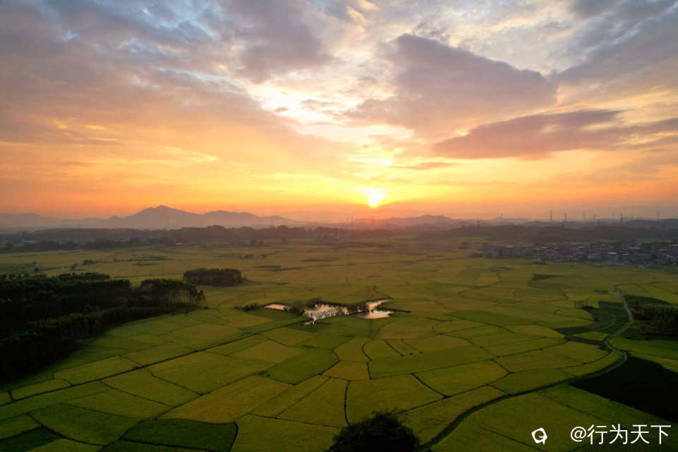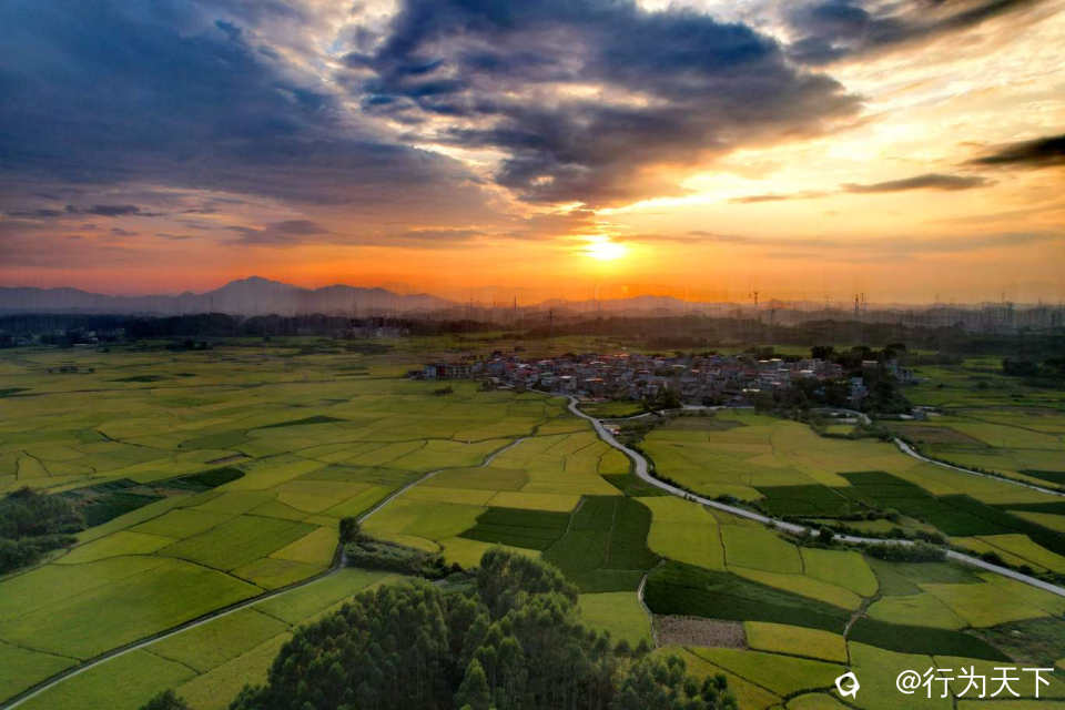 晚霞映衬下,稻田与村庄、公路构成一幅美丽的生态田园画卷,就像宫崎骏动漫里的秋天一样,早已成为了临桂的网红打卡点。过往的行人更会忍不住停下来,在这里逗留片刻,欣赏这绚烂的稻田、晚霞。