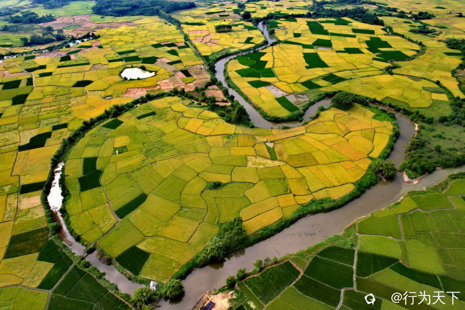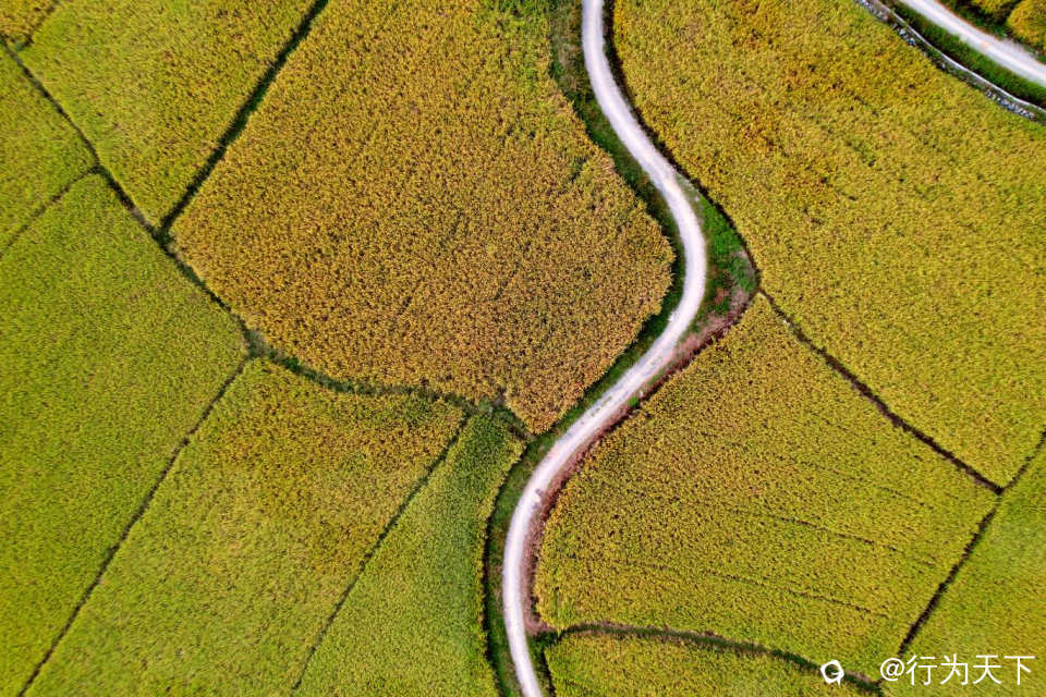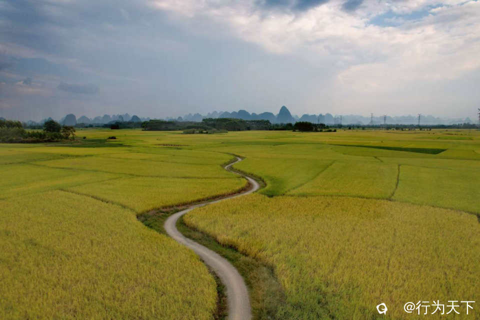 有一种金秋,叫做稻香,去不了诗和远方,就去临桂四塘稻田找找吧,这里有龙形的小路,龙形、心形的稻田。桂林金秋十月醉美的景,是湛蓝的天空和金黄的稻田,临桂区四塘镇大湾村上千亩水稻成熟了!连绵青山绿水间,金黄色稻浪层层平铺,如同描绘在秋天的油画世界。