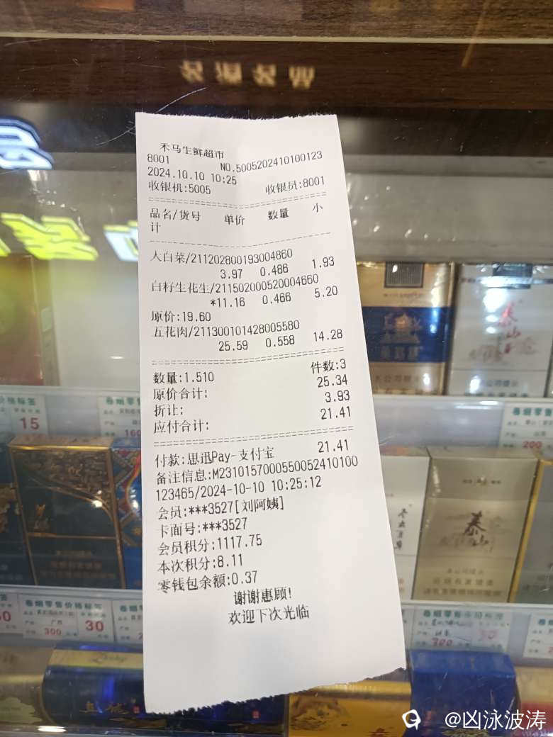 今天老人家外出有事,平时都是她买菜的,今天就由偶来买菜了,一出小区门口就看见一只金猫,猫来福,祝各位坛友生活幸福。禾马生鲜超市离我住的地方不远,说到禾马超市,偶就想到在临桂工作时。午餐就在该超市吃一元一个的馒头和花卷,条件特别艰苦。桂林市区是买不到的了。,偶发现超市收银来了一个小姐姐,她肯定是刚到社会吧把我的大白菜算到旁边的大叔,菜价里。还好旁边的姐及时发现。避免了发生的矛盾,但是有些大妈就,责骂了。这样是不对的,年轻人多包容她一下。我报的会员号小姐姐总听不清楚,要问第二次。我回想起二十年前我在保健品批发公司,做配送员时,发货给对方客户。看一眼班车的车牌号,我立马记住大脑里。马上打电话给客户。货几点到,车牌号是多少。这说明了一个社会问题,学校没有注重学生的能力培养。应该多让学生到社会上参加实践活动。比如到超市工作,到工厂工作。获得一些劳动报酬。这样到社会上不会认为社会在毒打她他了