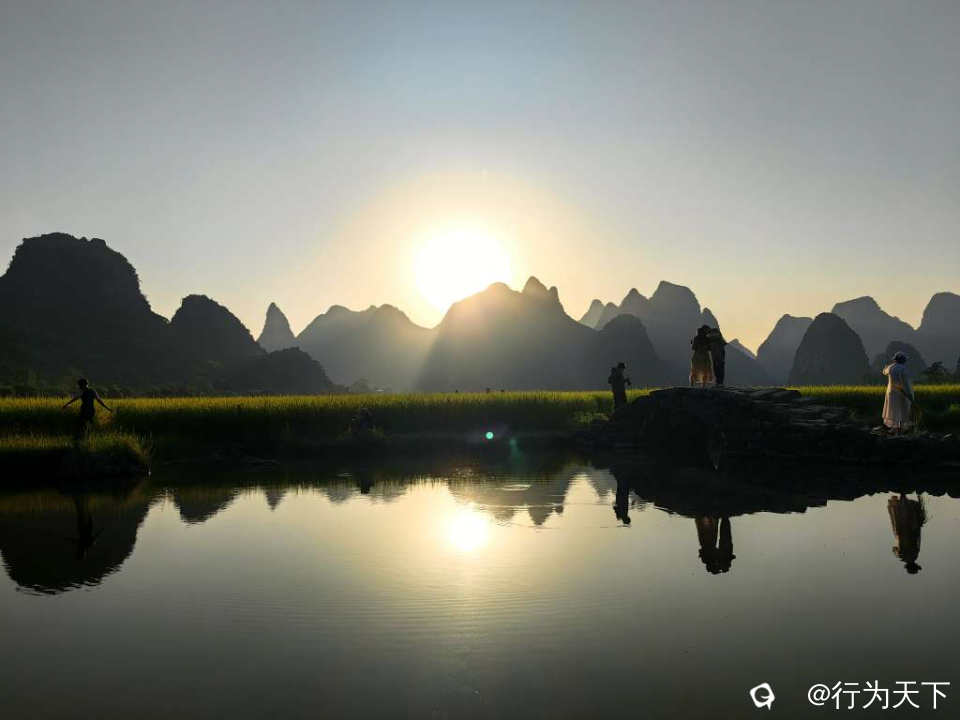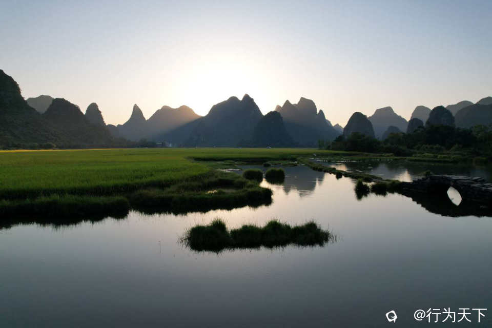 青山绿水,秀丽风光,远处,青山如黛,峰峦叠嶂,近处,绿树成荫,花香四溢。清晨来此,迎着日出,朝霞从群峰中冉冉升起,群峰沐浴阳光,与田园稻谷相印,水汽蒸腾的瞬间,“只见水牛来回走,不见状元来过桥”,成就难得一见的绝美画卷。