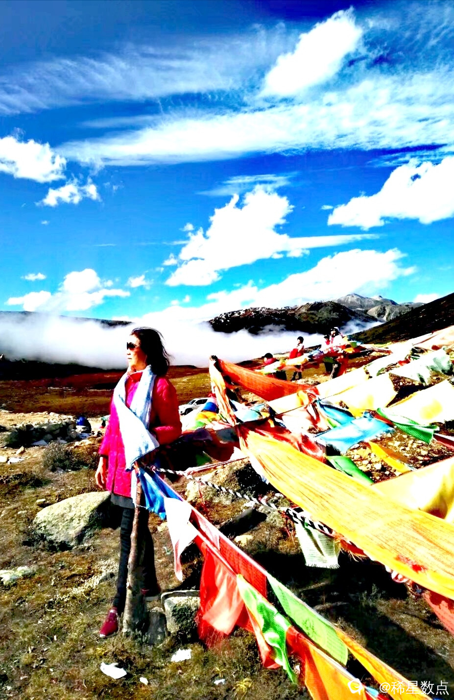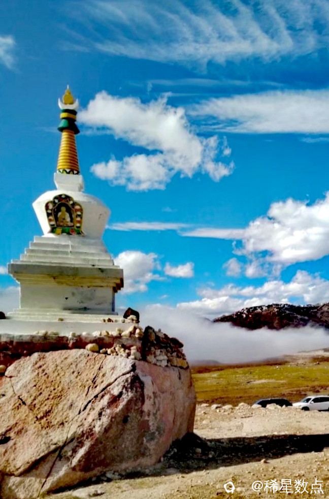 在藏区标志性五彩的经幡特别鲜艳夺目,藏族人很崇拜石头,他们把草地上的石块收集堆成各种造型。