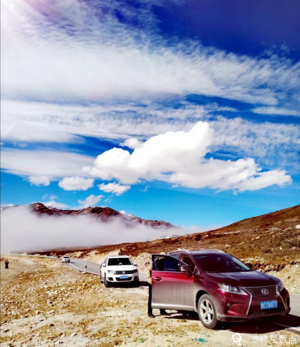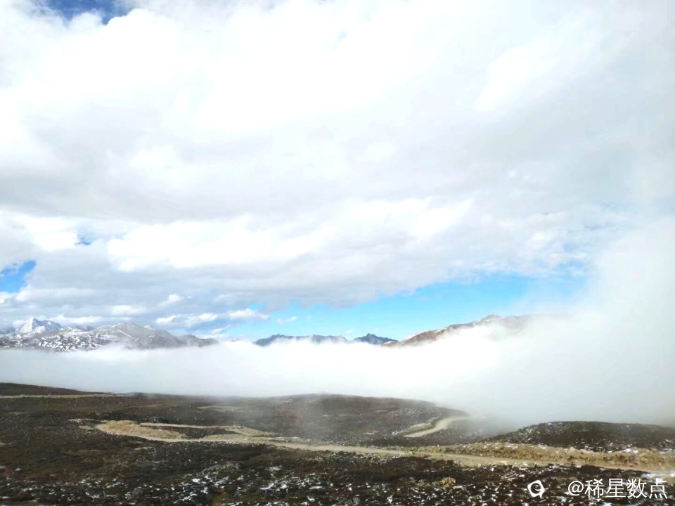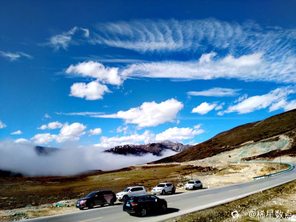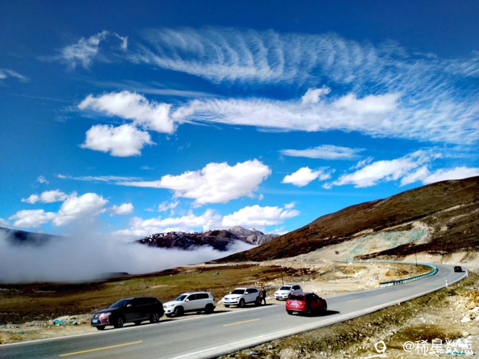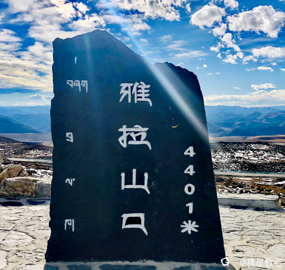 这里海拔有点高,在休息站里见到几个年轻人在吸氧。继续出发。道路两旁有一些积雪,与山顶连成一片。很快来到山顶,停了许多车,阳光特别刺眼,这是“雅拉山口”,海拔4401米。