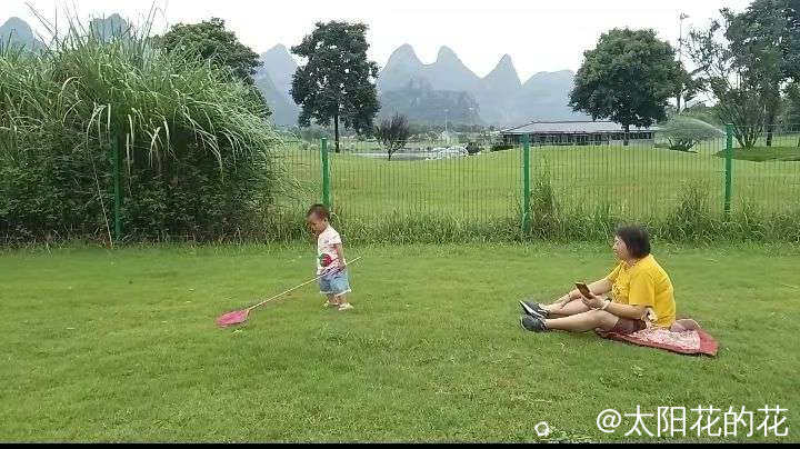 秋天的桂海晴岚景区:秋天郊外的草坪依然是绿油油的,某个小朋友在草坪上扑蝴蝶玩的好开心,童年时光一去不复返,尽情的玩吧………