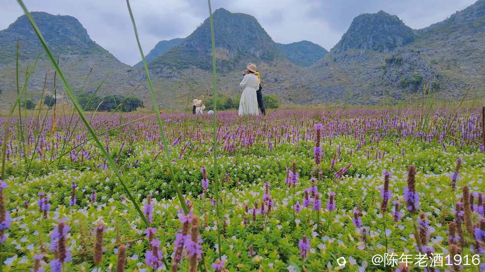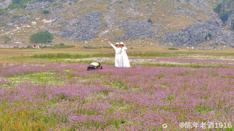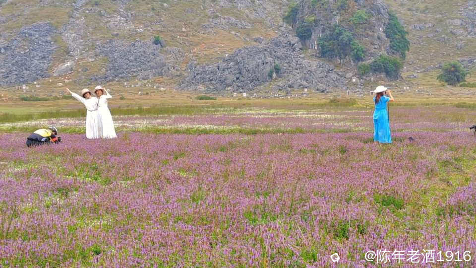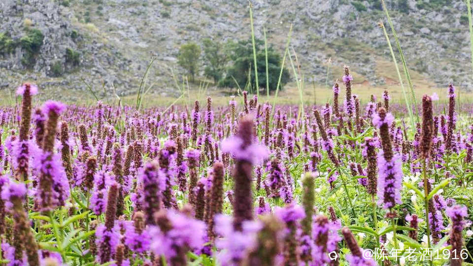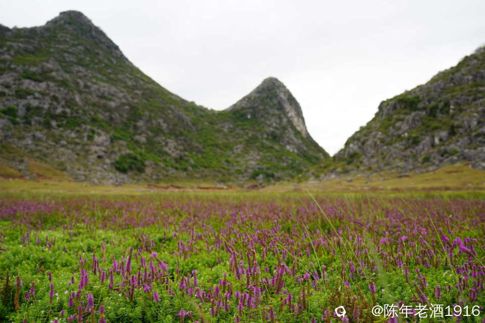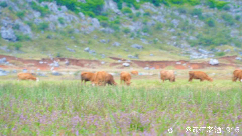 一天中午,午饭都顾不上吃,便只身开始寻迹之路,因为早几年前去过那里附近一处因“动物石林”而出名的山谷,幸而在众所周知之前就拍下部分形象的动物石林照片,后来被人活生生毁掉了,这也许就是大神们不愿告知紫色花海坐标的苦衷,直觉告诉我所谓的紫色花海应该就在附近,所以凭感觉误打误撞找到了这处“隐秘之境”,此处四面环山,两头各有一条通往外面的土石路,犹如一个大大的聚宝盆,中间是一片大草地,里面有人在放牛,风景确实不错。有一辆小车和几辆电动自行车停在入口处,远处望去盆地中间透着若隐若现的“紫色“,有几个身着艳丽的身影在变换着身姿拍照、录视频。走近跟他(她)们打了个招呼,聊天中得知,他们往年大概这个时候都来这里打卡,只是今年的花期比往年早了点。原来所谓的“隐秘之境”早已不是什么秘密,其实早就被公诸于世,只是现在大家对这些“秘境”多了些向往,跟着“前辈”的步伐也要到此一游打打卡,当然,我也不例外。