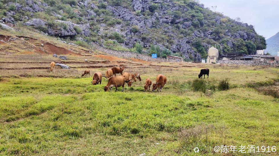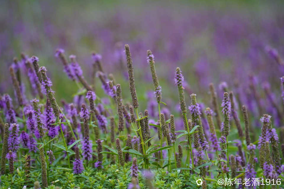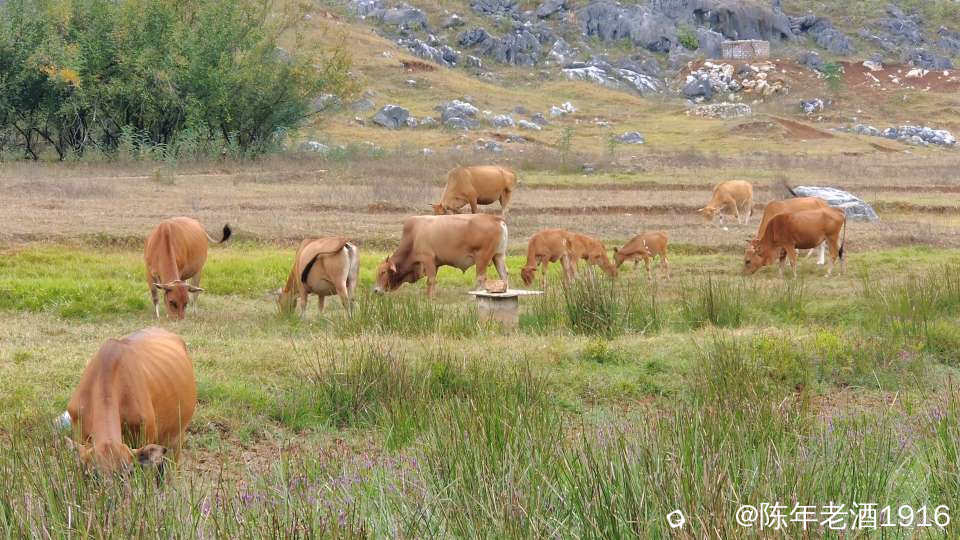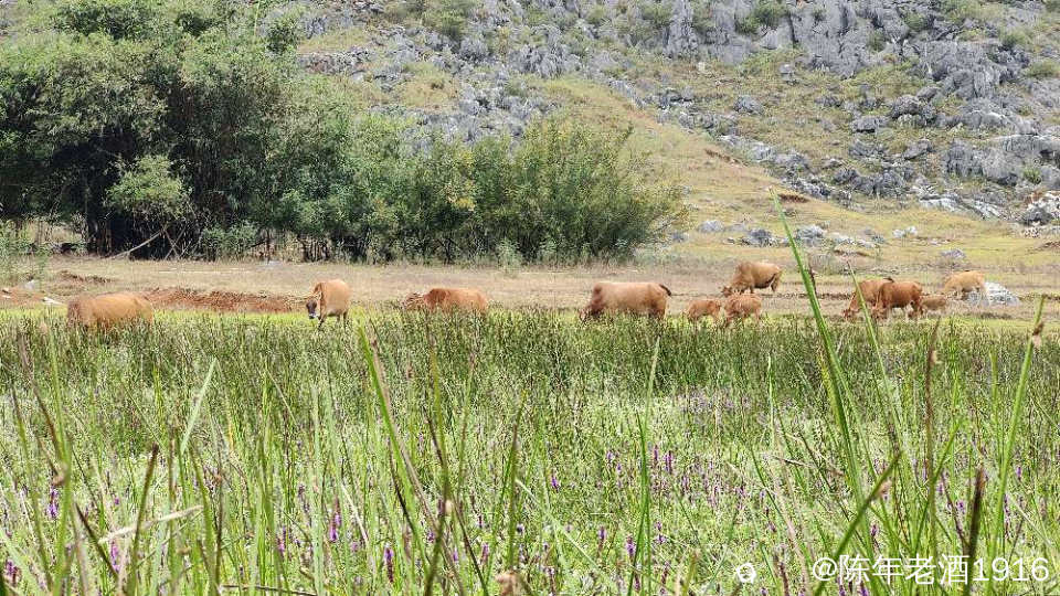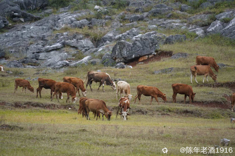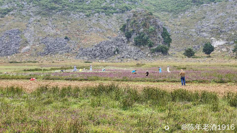 一天中午,午饭都顾不上吃,便只身开始寻迹之路,因为早几年前去过那里附近一处因“动物石林”而出名的山谷,幸而在众所周知之前就拍下部分形象的动物石林照片,后来被人活生生毁掉了,这也许就是大神们不愿告知紫色花海坐标的苦衷,直觉告诉我所谓的紫色花海应该就在附近,所以凭感觉误打误撞找到了这处“隐秘之境”,此处四面环山,两头各有一条通往外面的土石路,犹如一个大大的聚宝盆,中间是一片大草地,里面有人在放牛,风景确实不错。有一辆小车和几辆电动自行车停在入口处,远处望去盆地中间透着若隐若现的“紫色“,有几个身着艳丽的身影在变换着身姿拍照、录视频。走近跟他(她)们打了个招呼,聊天中得知,他们往年大概这个时候都来这里打卡,只是今年的花期比往年早了点。原来所谓的“隐秘之境”早已不是什么秘密,其实早就被公诸于世,只是现在大家对这些“秘境”多了些向往,跟着“前辈”的步伐也要到此一游打打卡,当然,我也不例外。