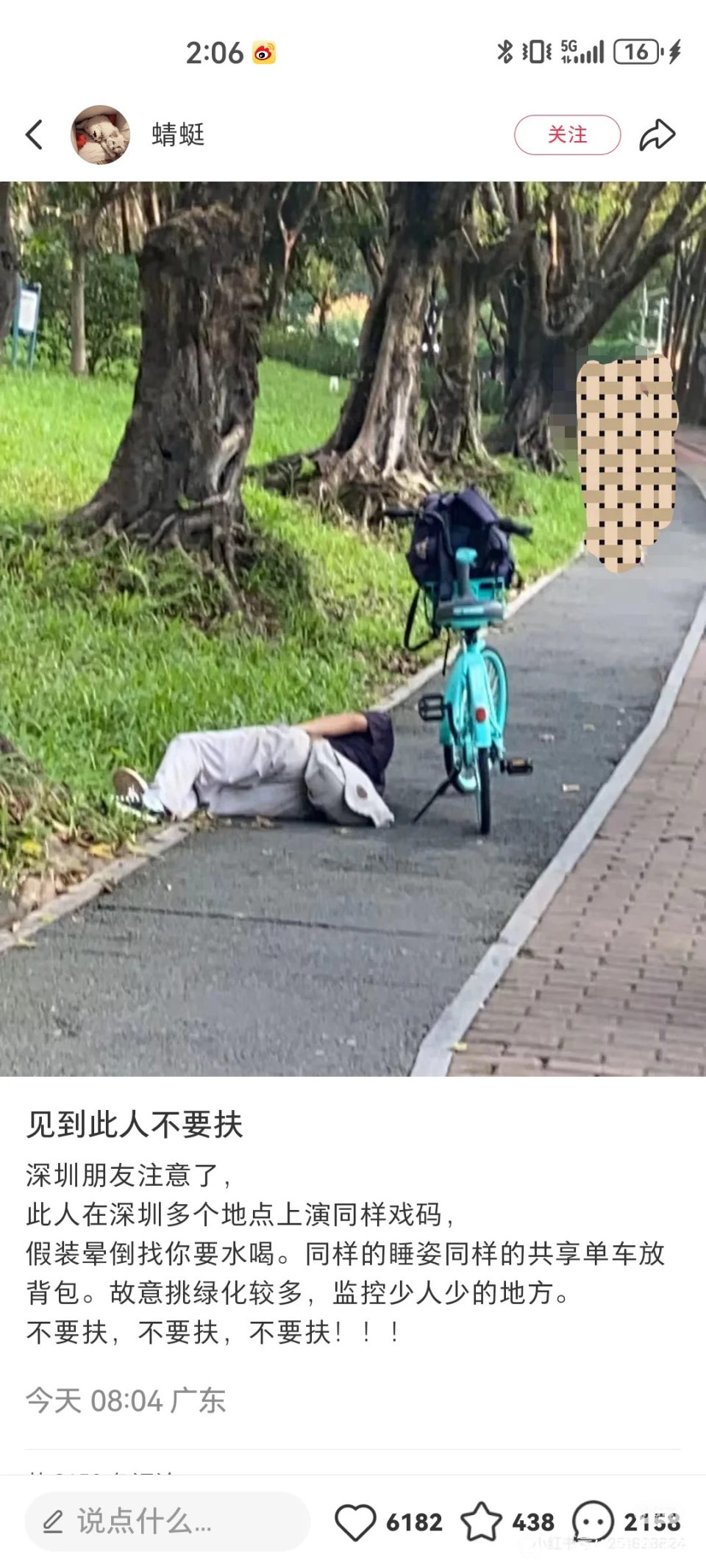好在有一位路人大哥观察仔细,讲他的单车上上锁的。这下很多人就知道是什么情况了,如果是其它自行车还能理解是他钥匙丢了,共享单车扫码就可以骑,你拿一辆上锁的车也没有用。十有八九是假装骑车摔倒讹人钱财,大家就散了。