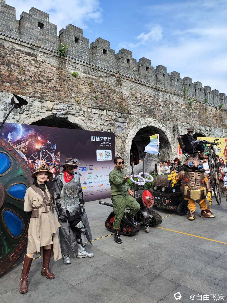 这个秋季,桂林艺术节又开始了,节目越来越多,越来越好玩了,去年有新西兰土著的毛利舞,异国情调非常欢快,今年在王城根表演的是来自北京的朋克星球,一种非常特殊的非主流文化,融合了戏剧、视觉、科技的表演方式,也是非常欢快。