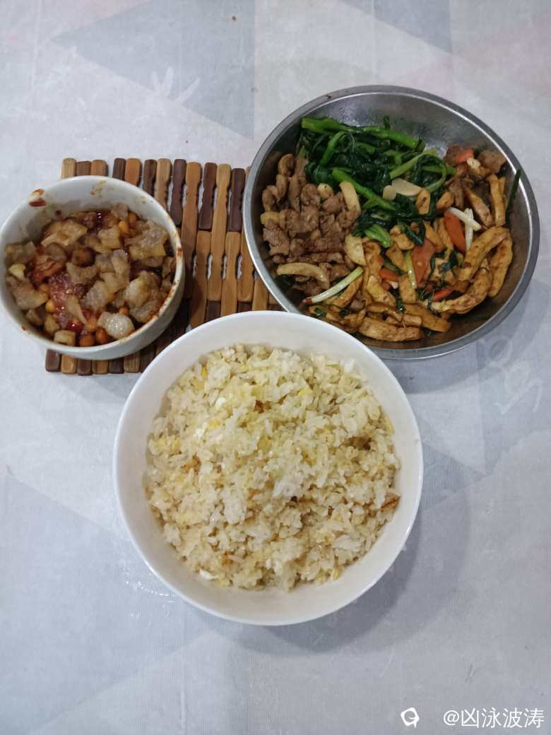 偶今天当班有点累,下班就呼噜噜。一觉醒来就是六点半了。自己就做了一个蛋炒饭,去菜市场买了点豆酱和二师兄的肉。蒸了一下,顺便炒了个菜。就这样一个人的晚餐