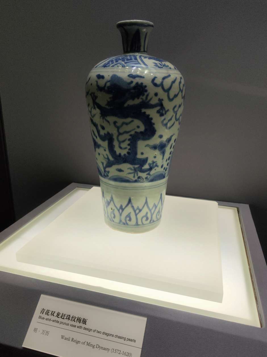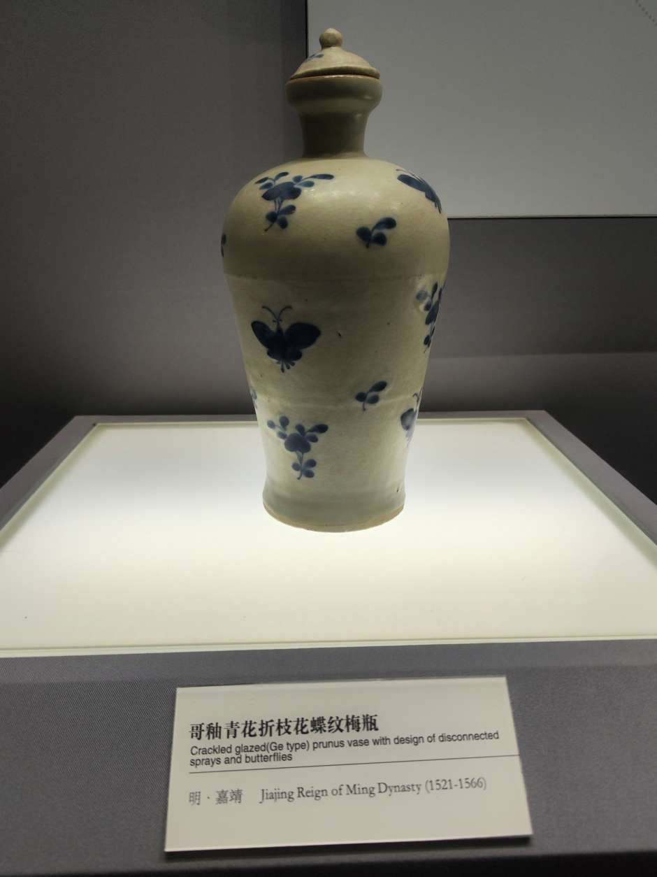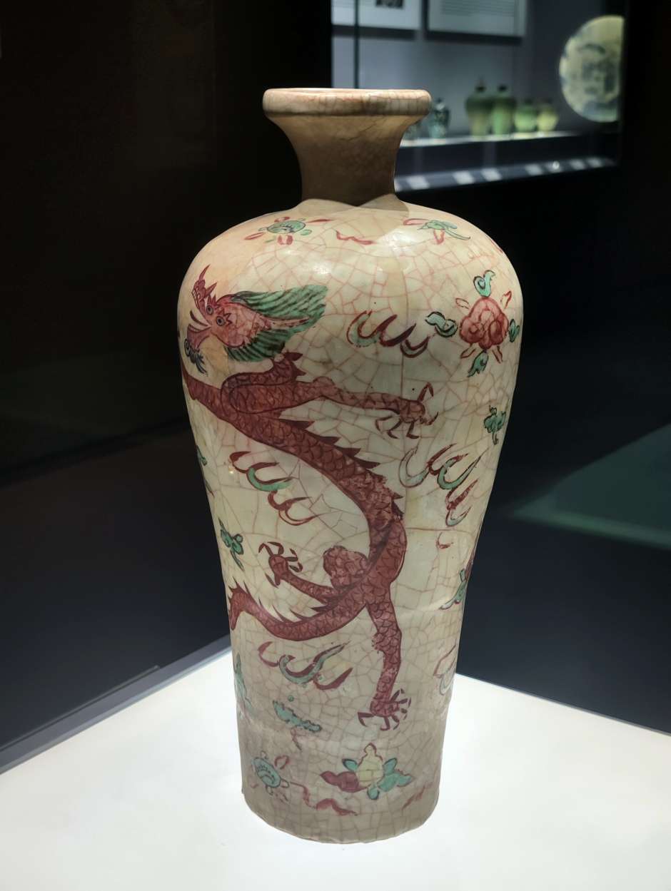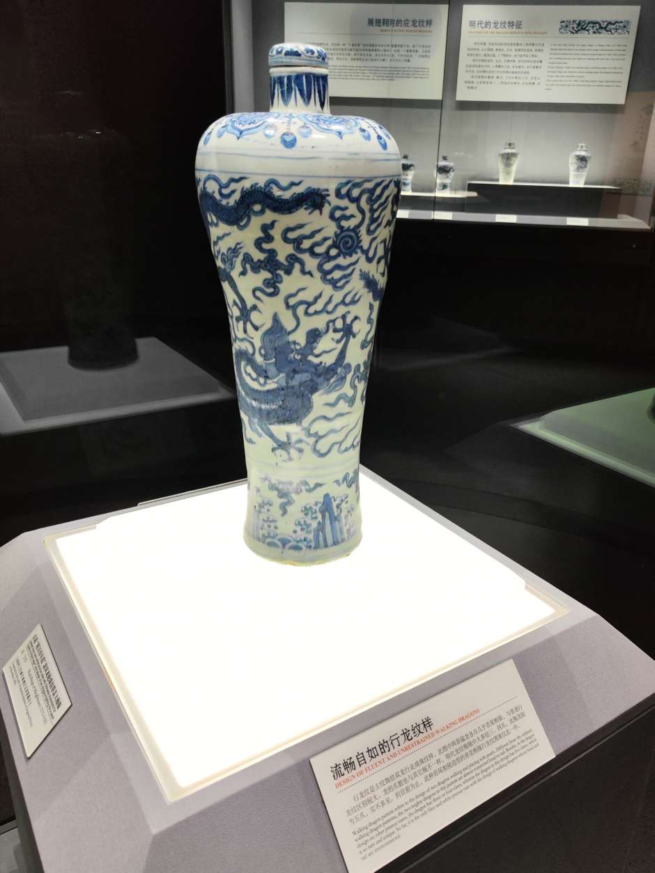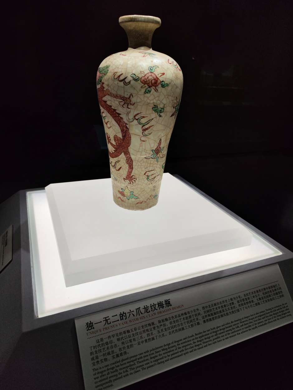 这个展厅有大量的梅瓶,明朝的居多,以前来博物馆见到这些梅瓶,一个个光泽黯淡,釉面斑驳坑洼,有的图案信笔涂鸦,居然画出六爪的龙,和外面常见的锃光瓦亮的现代陶瓷花瓶相差太远,就以为展出的是仿制品,真品收起来了,通过一段时间学习长了一点见识,明白了哪些是宝光哪些叫贼光,弄懂了古代工艺和现代科技的差别,这次再看才知道这些梅瓶都是无价之宝,现代工艺花瓶不值半文,陈列品图中有一个是现代仿制品,你能够找出来吗?