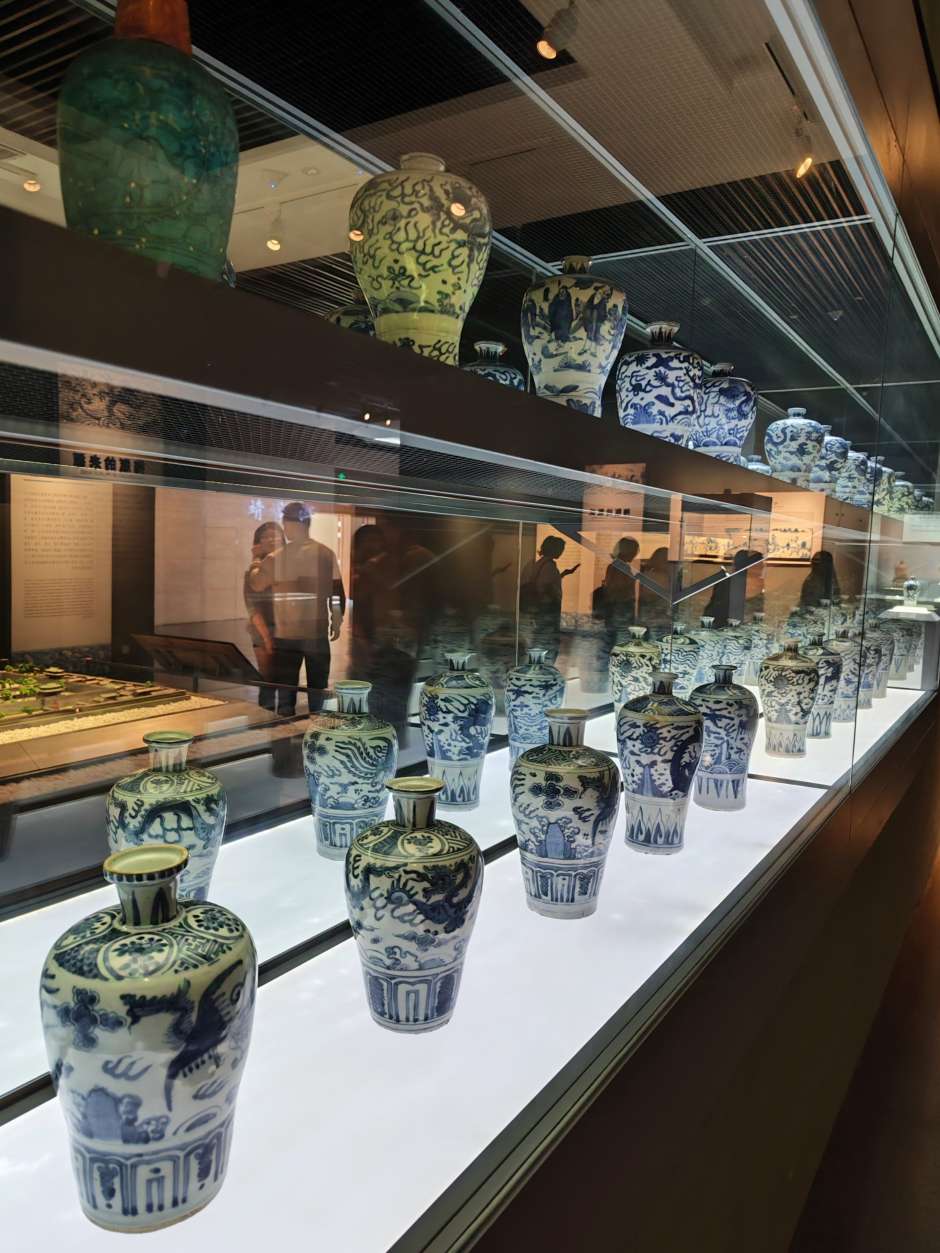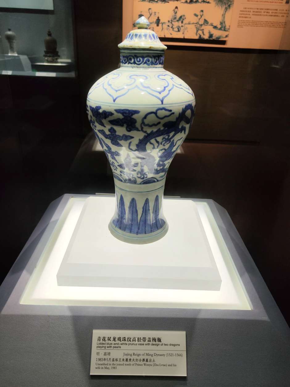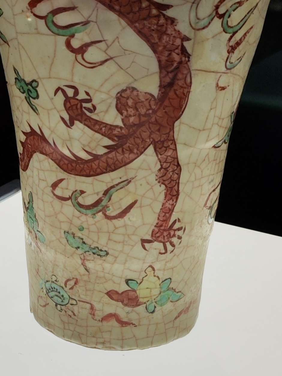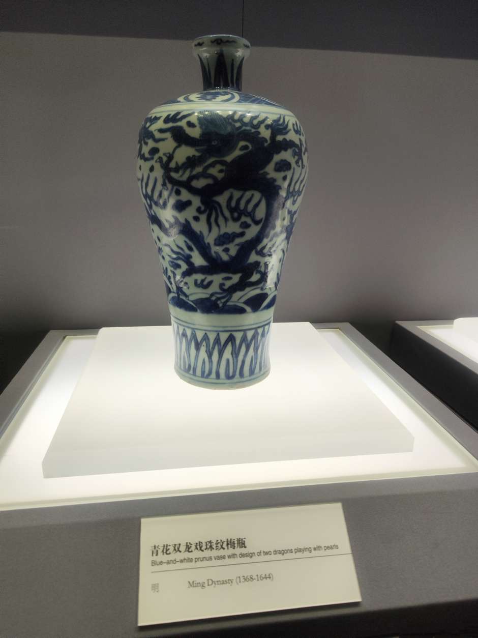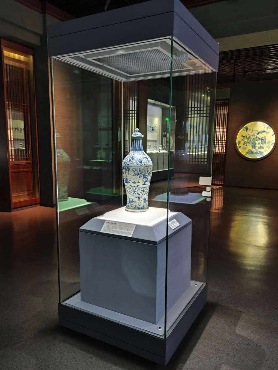 这个展厅有大量的梅瓶,明朝的居多,以前来博物馆见到这些梅瓶,一个个光泽黯淡,釉面斑驳坑洼,有的图案信笔涂鸦,居然画出六爪的龙,和外面常见的锃光瓦亮的现代陶瓷花瓶相差太远,就以为展出的是仿制品,真品收起来了,通过一段时间学习长了一点见识,明白了哪些是宝光哪些叫贼光,弄懂了古代工艺和现代科技的差别,这次再看才知道这些梅瓶都是无价之宝,现代工艺花瓶不值半文,陈列品图中有一个是现代仿制品,你能够找出来吗?