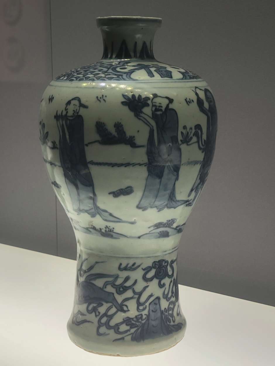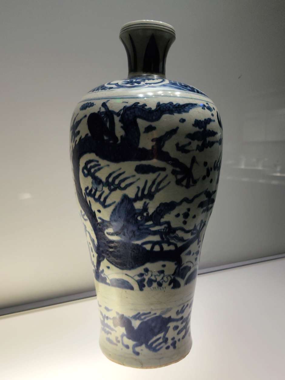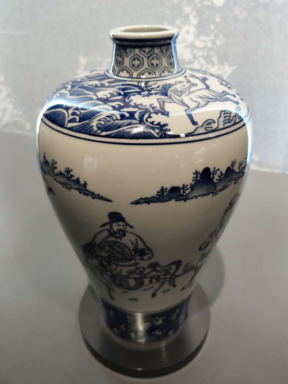 发现梅瓶图案很多模模糊糊的,可能是烧制时绘画笔触被熔化了,像是PS用了模糊工具一样。