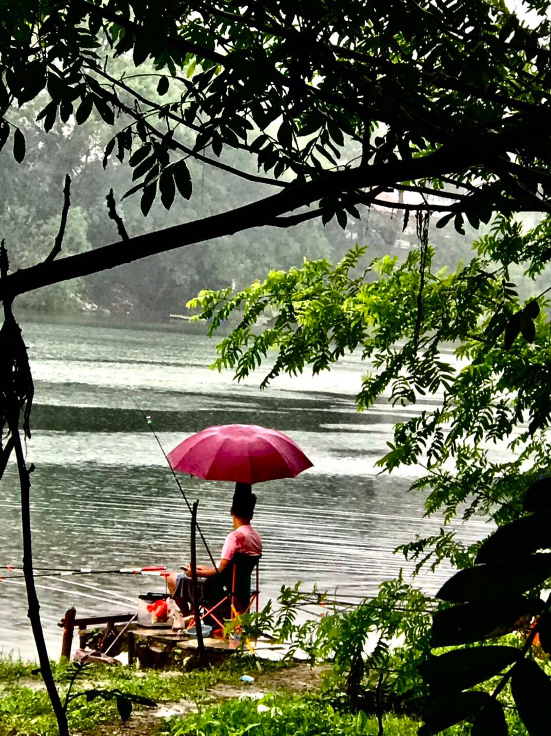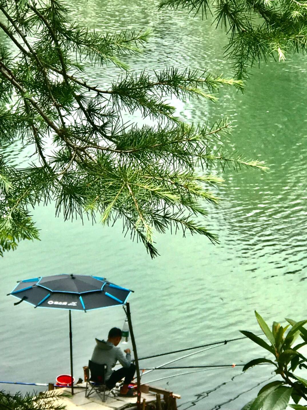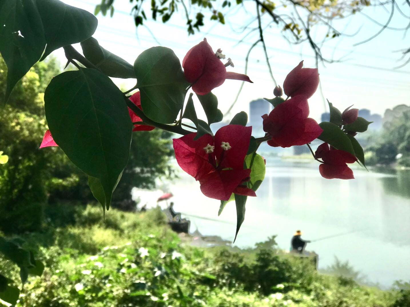 绿树,碧波,花下,悠闲垂钓人,犹如在画中。